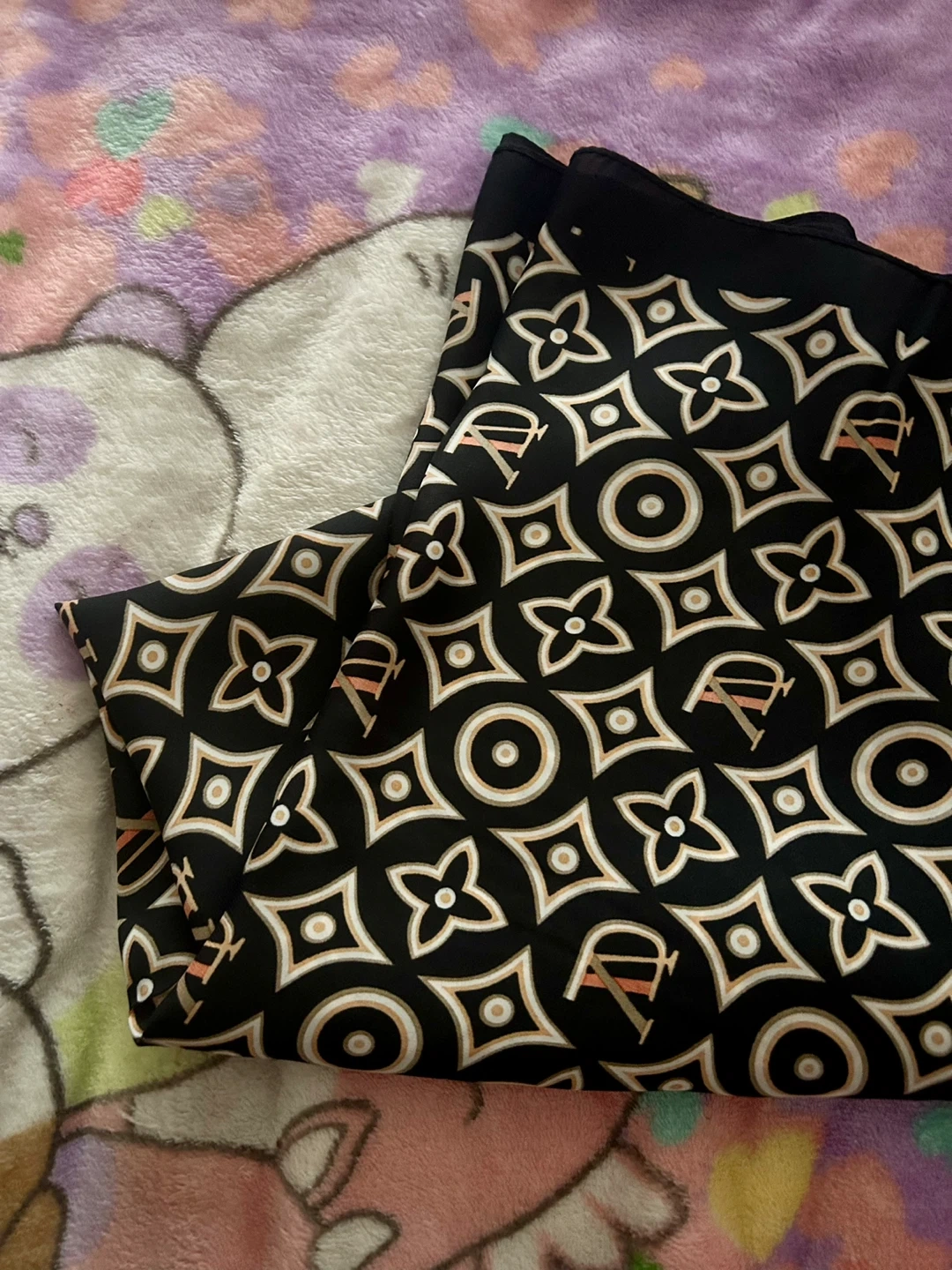 BLACK SILK FLORAL GEOMETRIC MONOGRAM SCARF