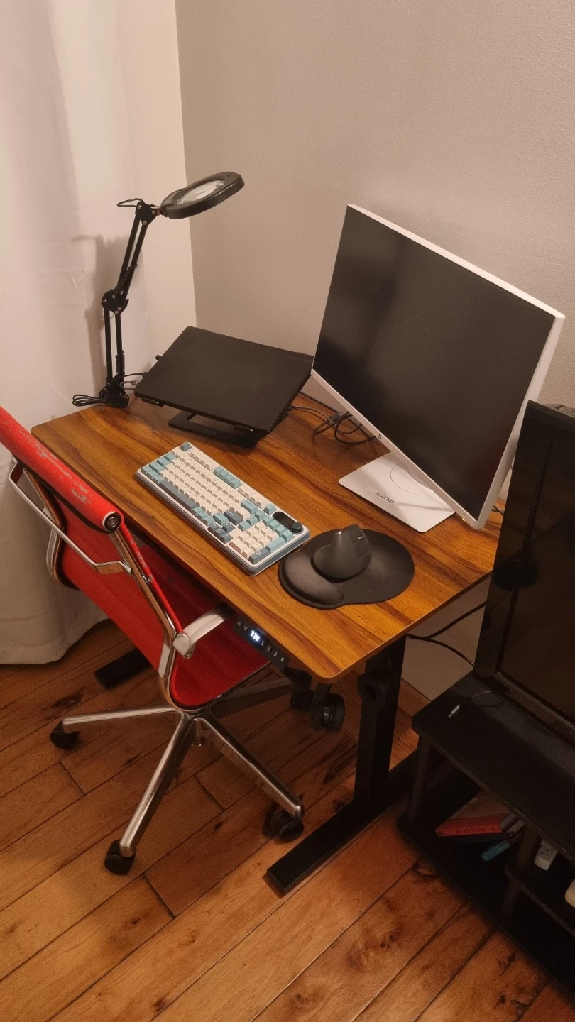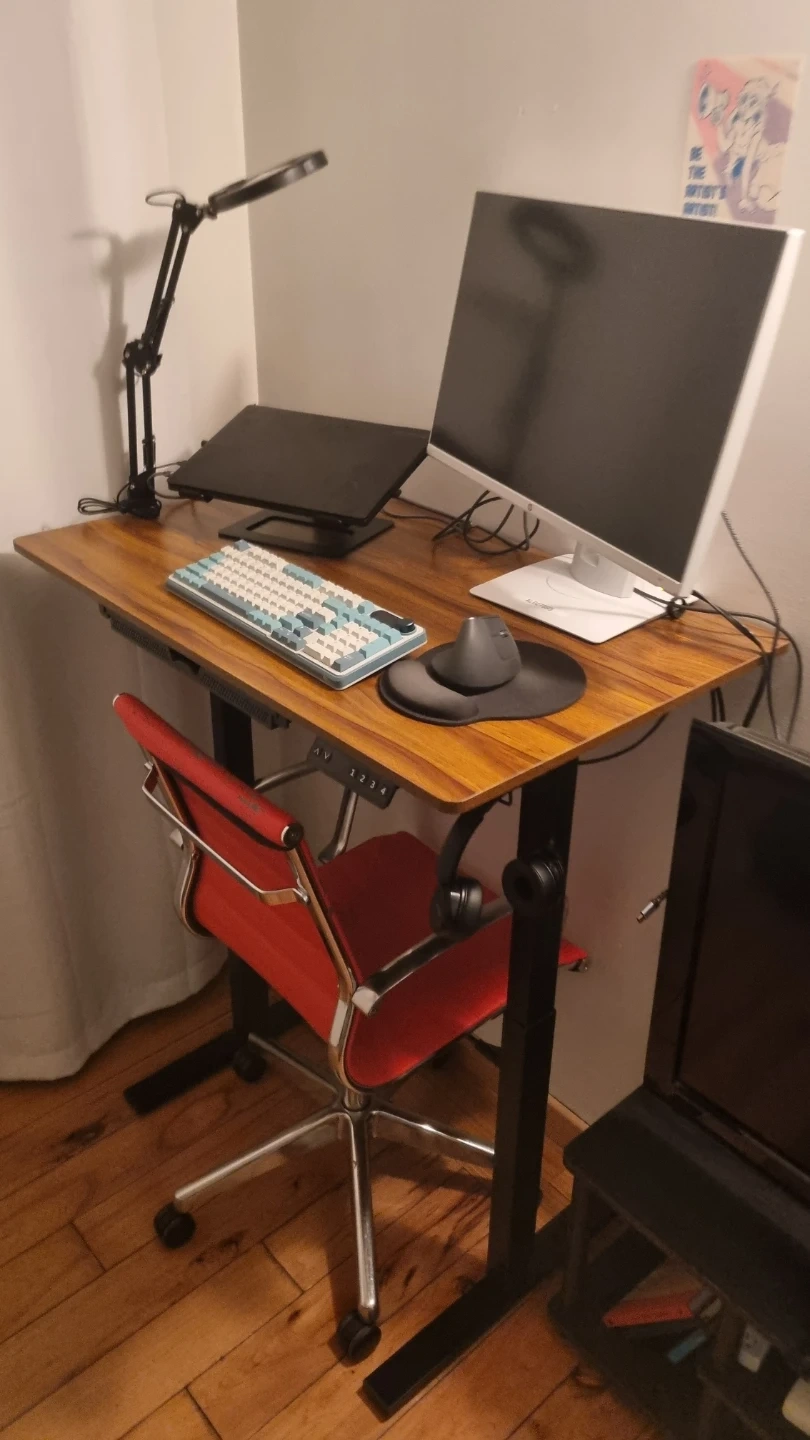 Electric standing desk with a walnut wood grain finish. It features a digital display for height adjustment and memory presets. The desk has a sturdy metal frame with adjustable legs.