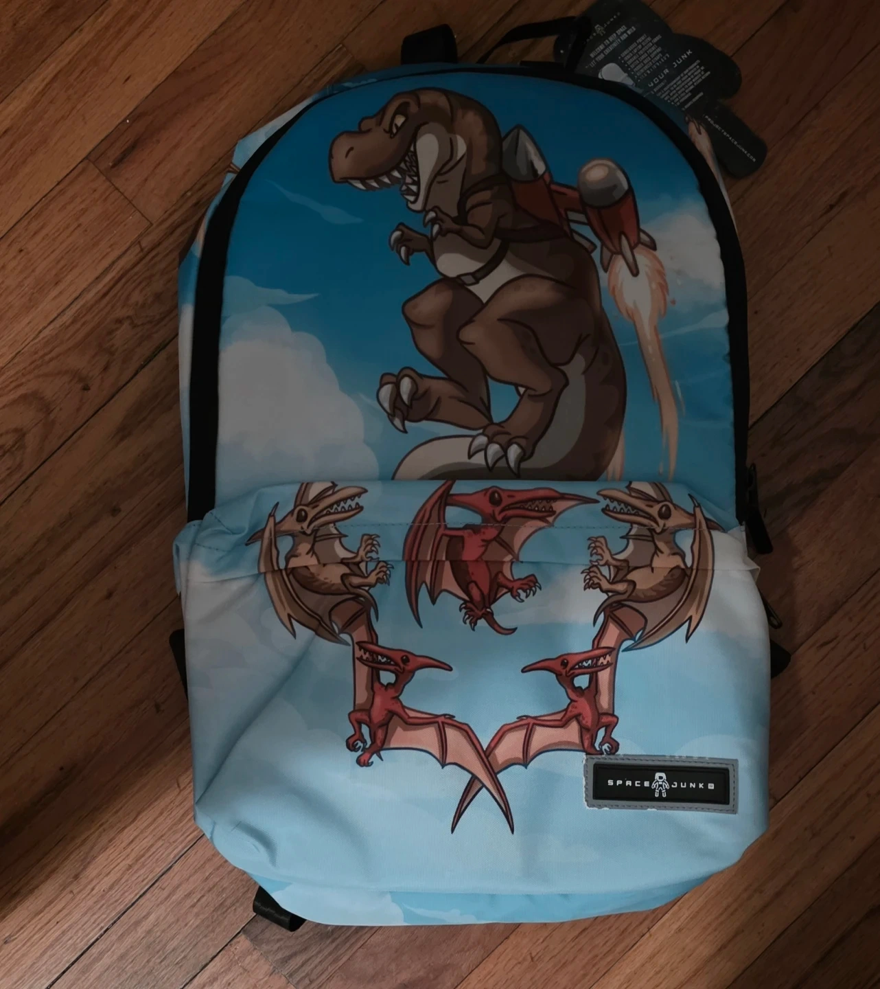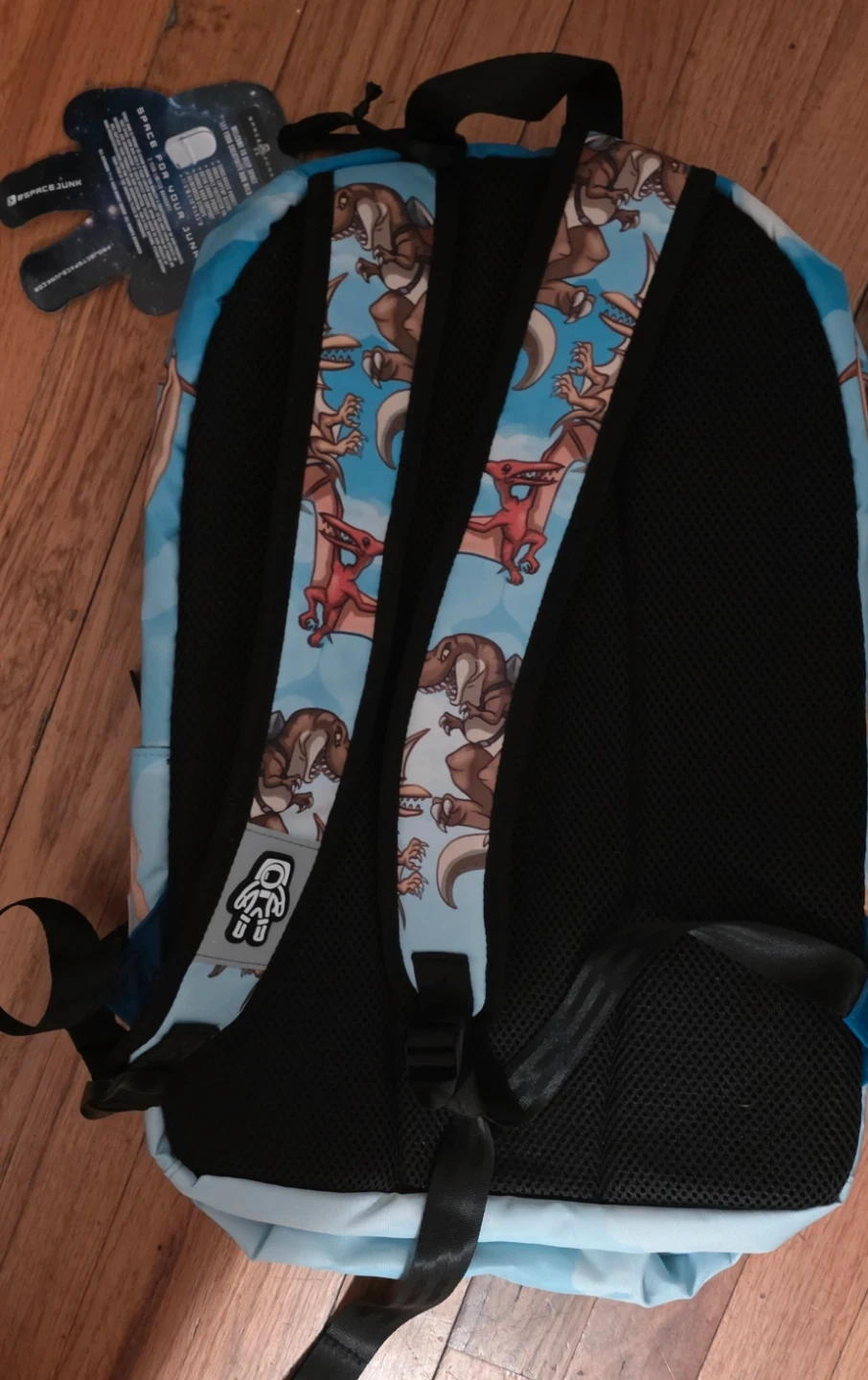 This Space Junk backpack features a fun dinosaur graphic. It's great for kids heading back to school or for carrying essentials. The straps are adjustable for a comfortable fit.