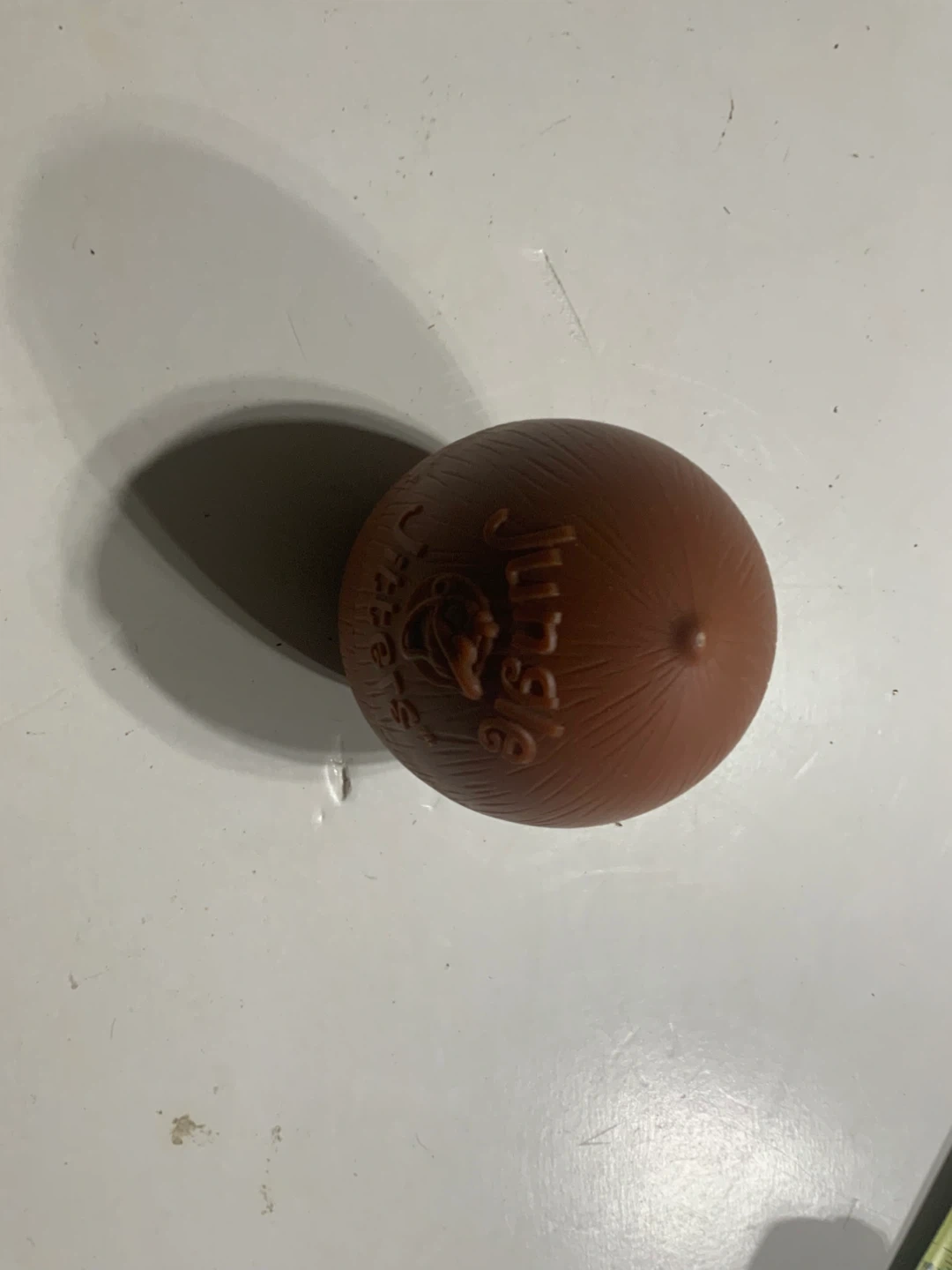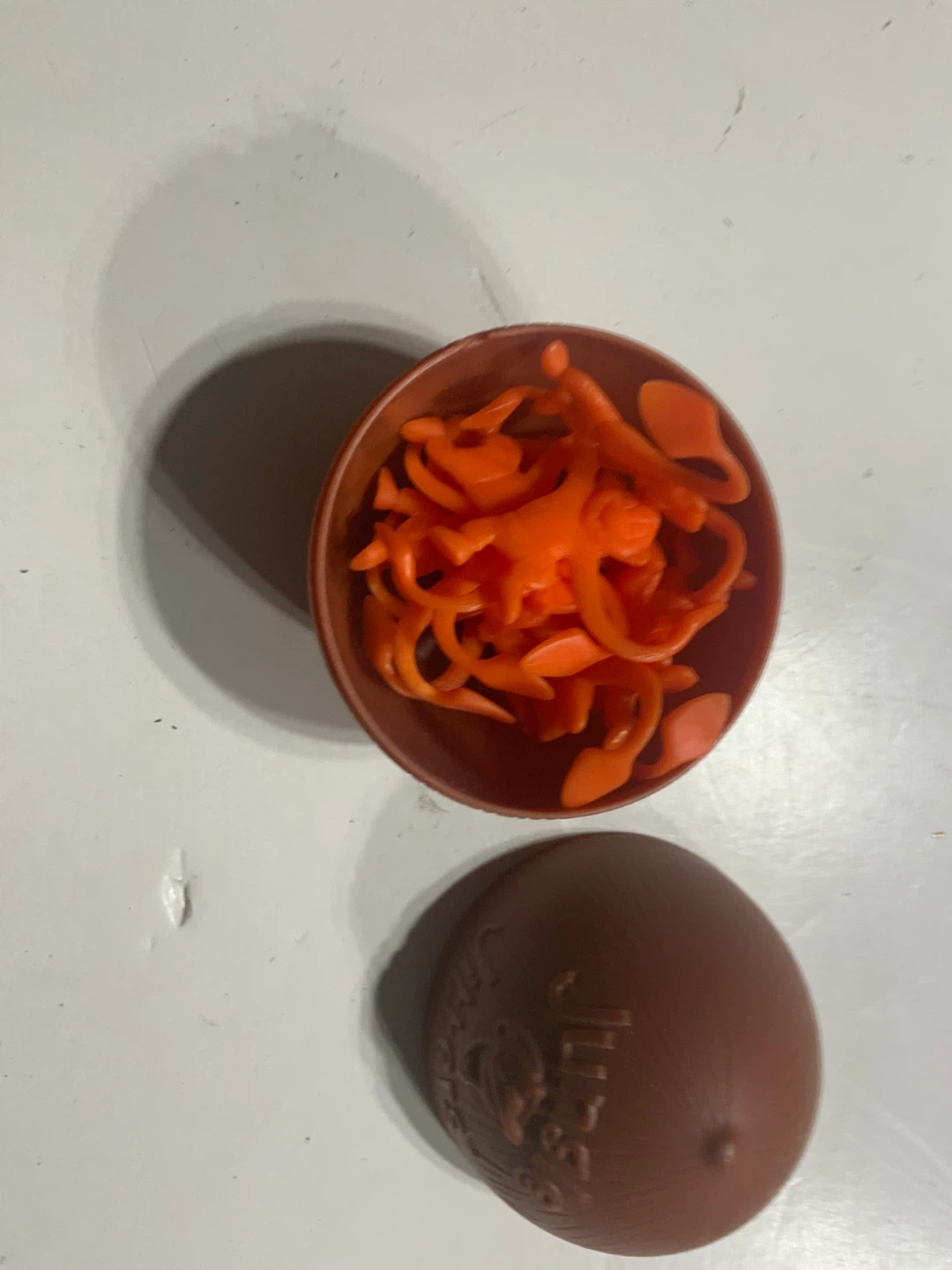 This Jumbo toy comes with small orange animal figures inside a brown egg-shaped container. It's a fun collectible for kids. The container has 'Jumbo' embossed on it.