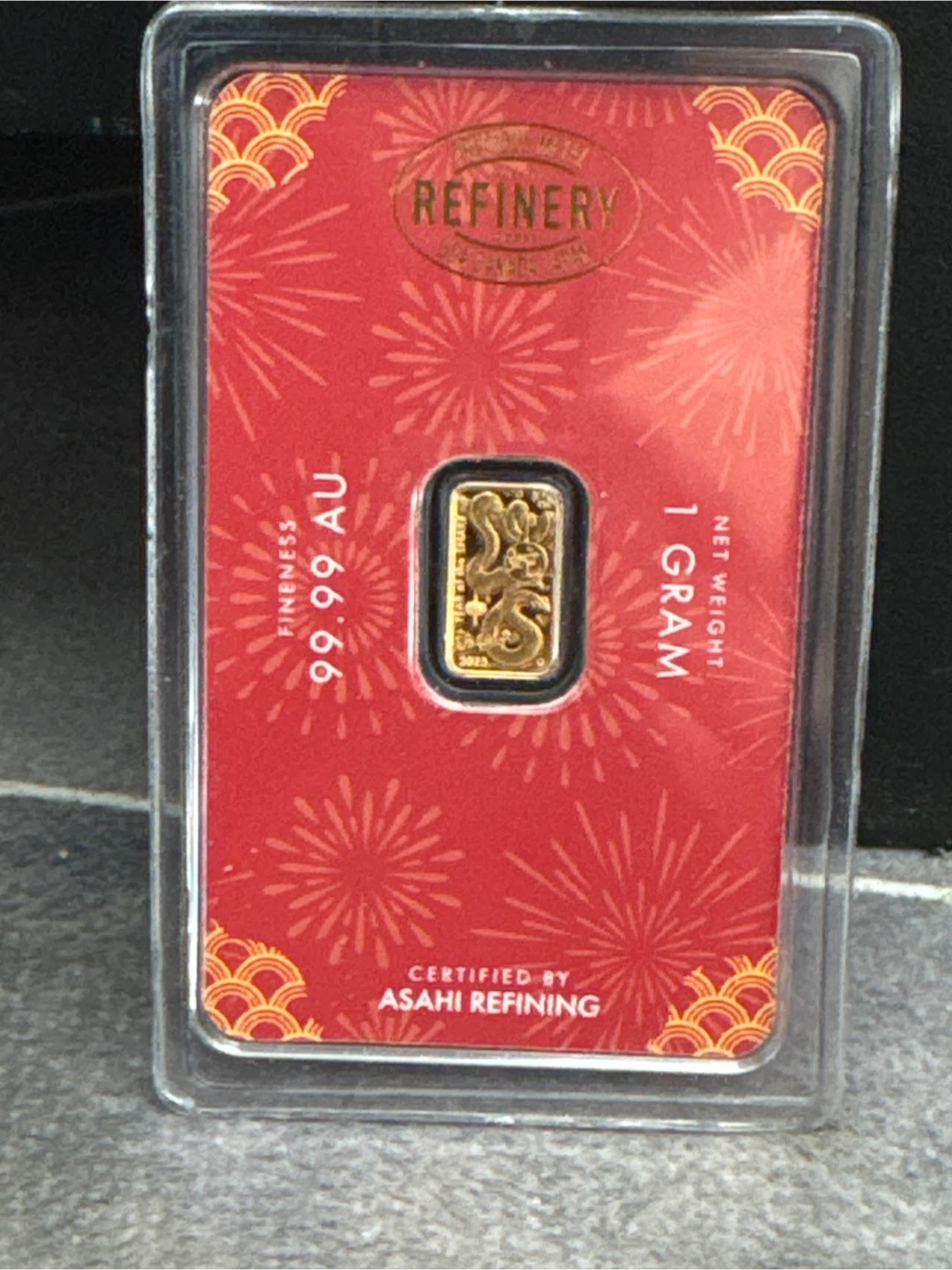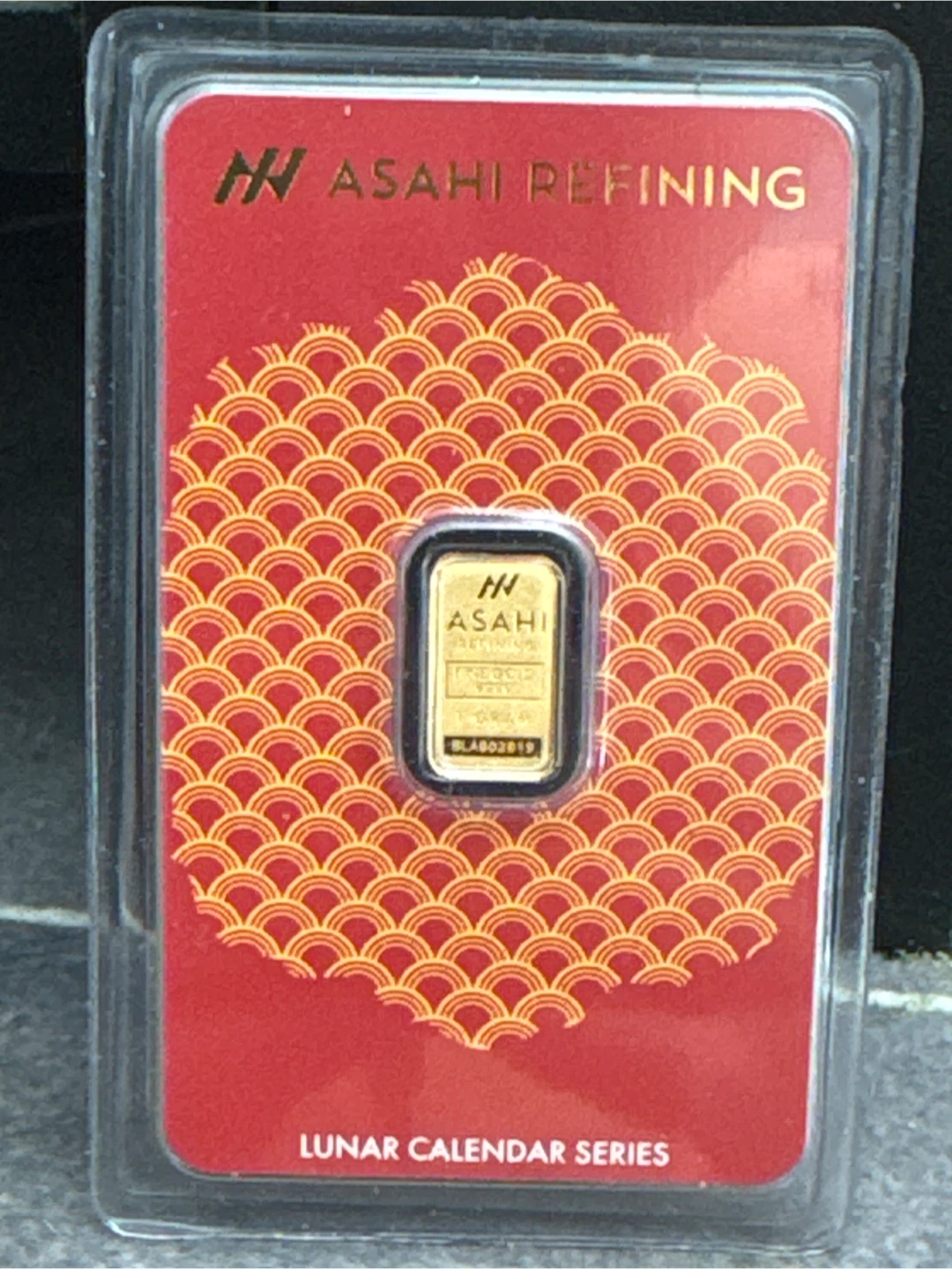 This is a 1 gram gold bar from Asahi Refining, part of their Lunar Calendar Series. It's certified with 99.99 AU fineness. The bar comes in protective packaging.