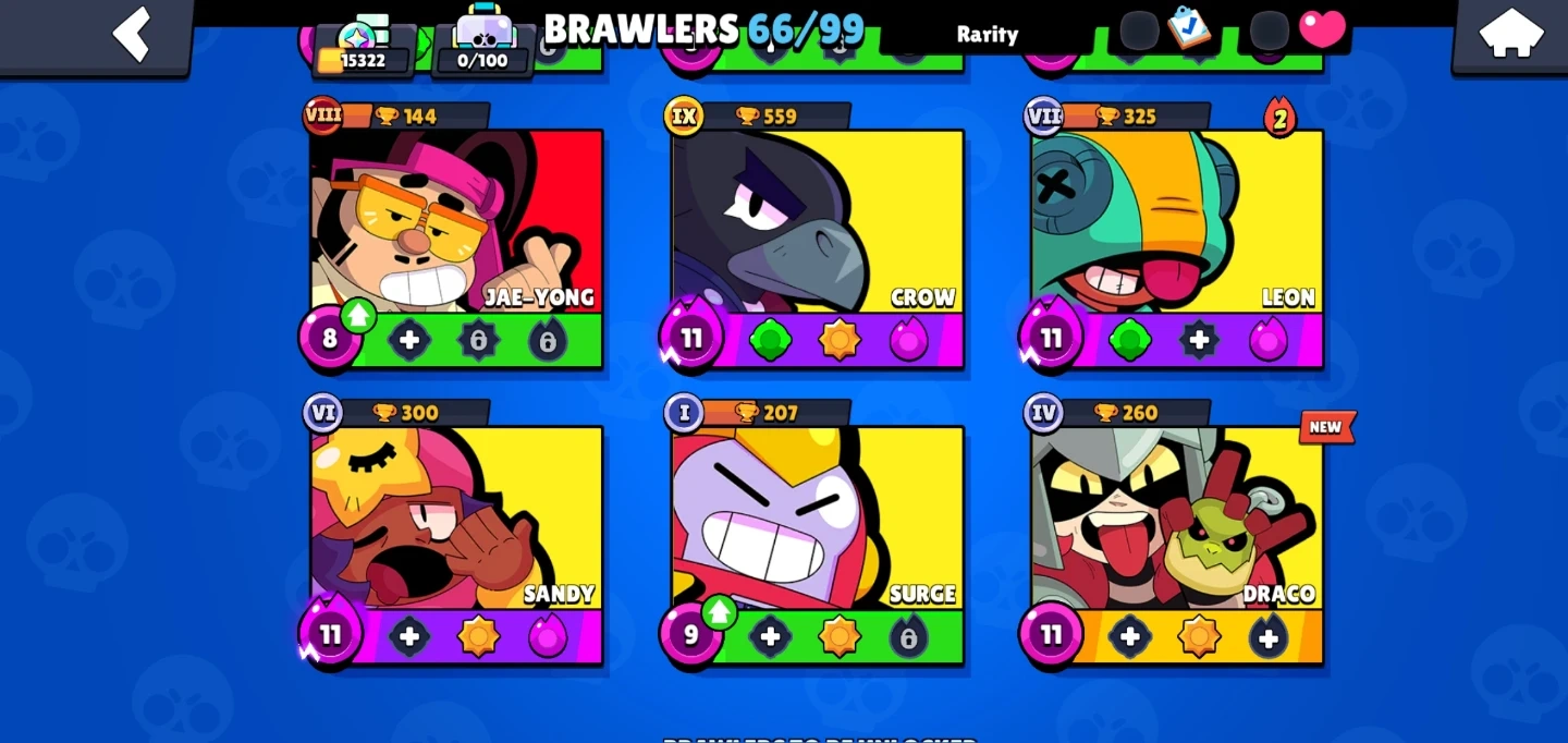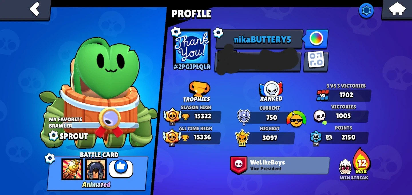 Account with 15322 season high trophies and 15336 all-time high. Features ranked current 750 and highest 3097. Includes over 1000 victories and 66/99 brawlers, with several at max level. Multiple high-level brawlers and good win rates. Great for competitive players!