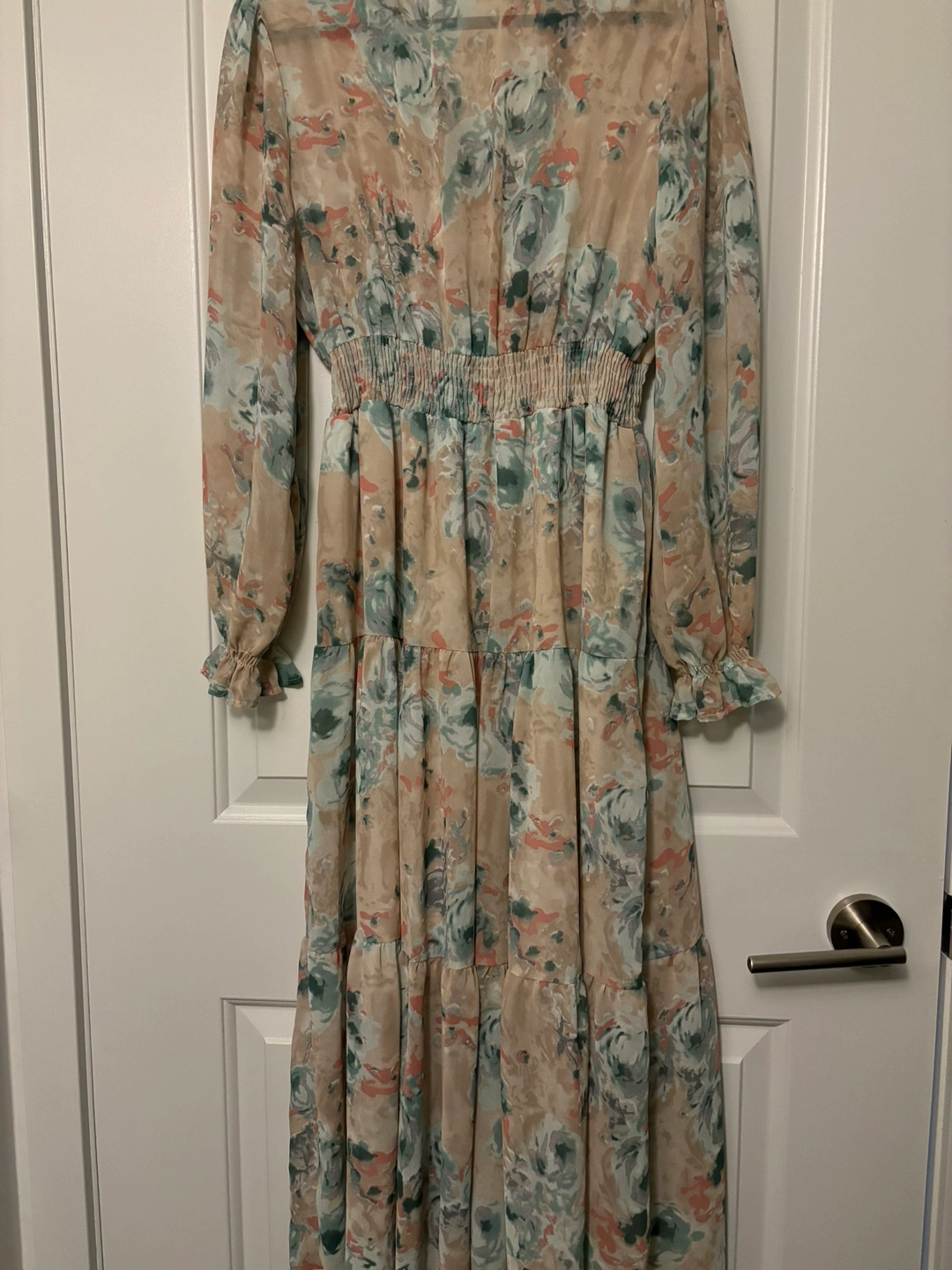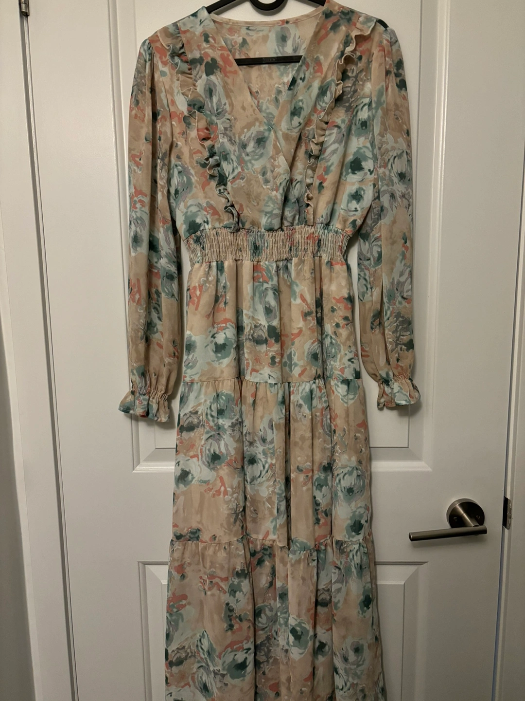Beautiful floral print maxi dress. The dress features a v-neck, long sleeves, and a tiered skirt. The dress has an elastic waistband and is made of a lightweight material that is perfect for summer. The dress is in great condition and has never been worn.
