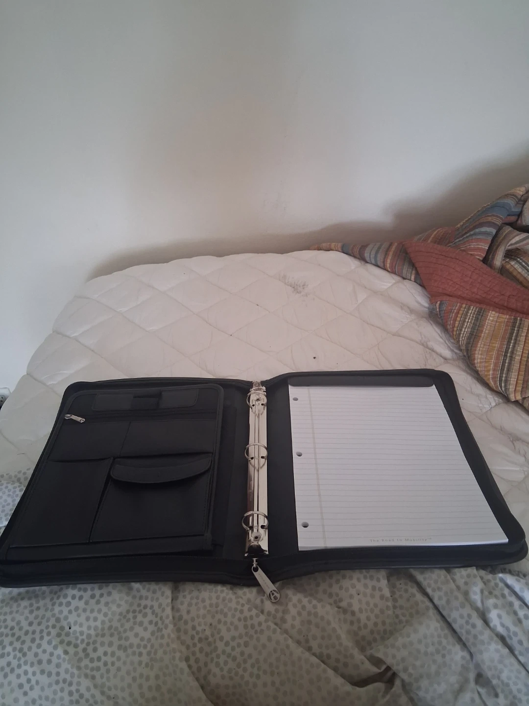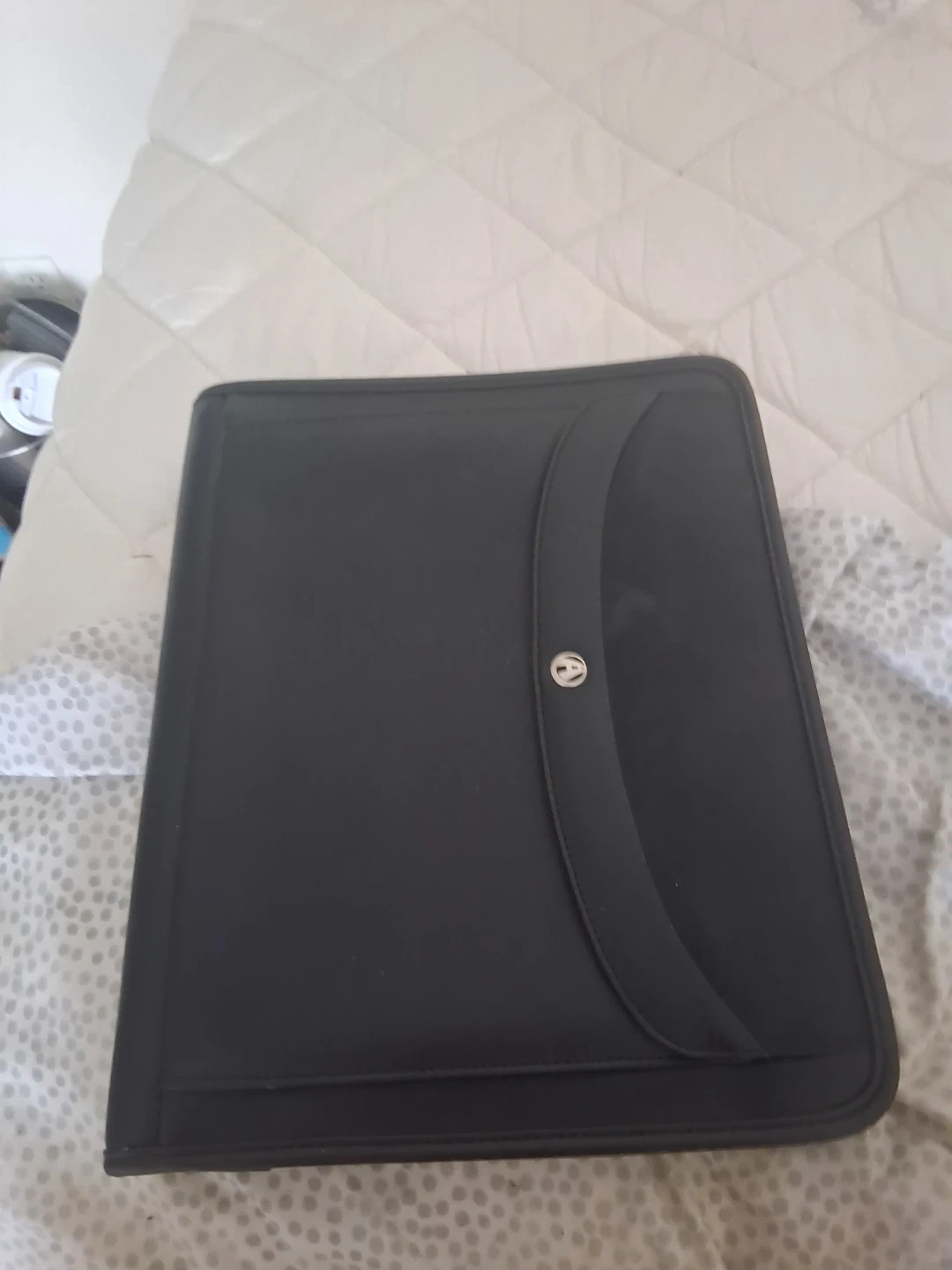 This professional portfolio binder is black with a snap closure. It's made of faux leather and includes a 3-ring binder mechanism and multiple interior pockets. Perfect for organizing documents and notes for meetings or classes!
