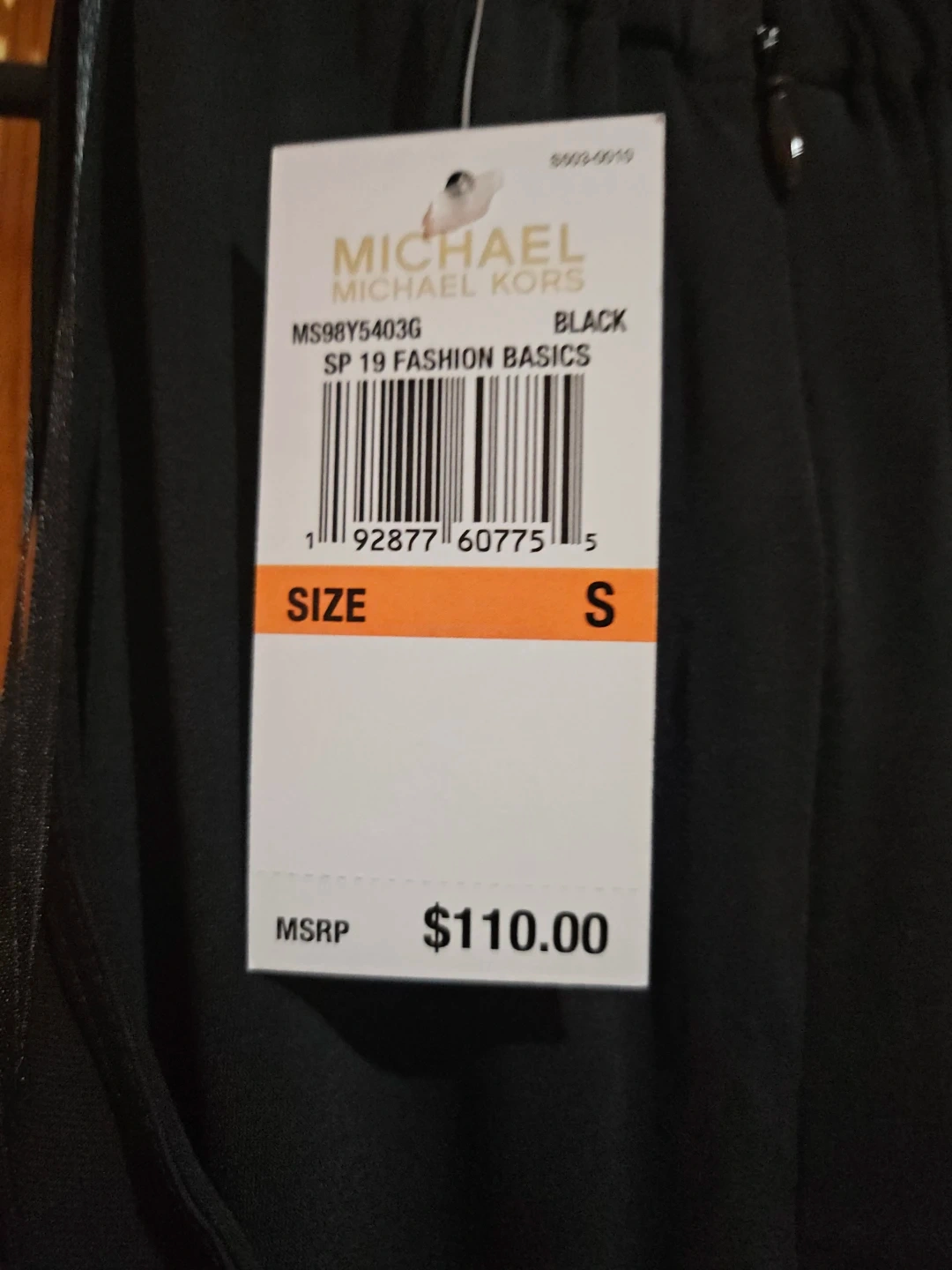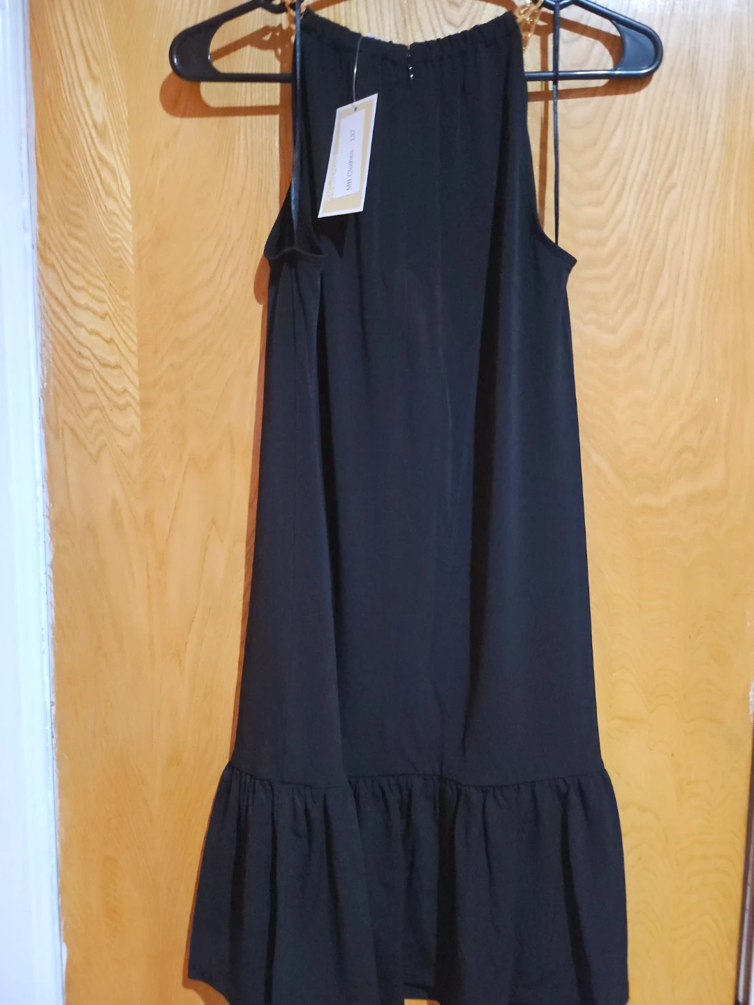 Michael Kors black sleeveless dress with gold chain detail at the neckline. It's a size small. Features a ruffled hem. Perfect for a night out!