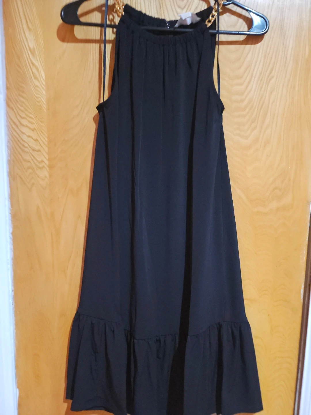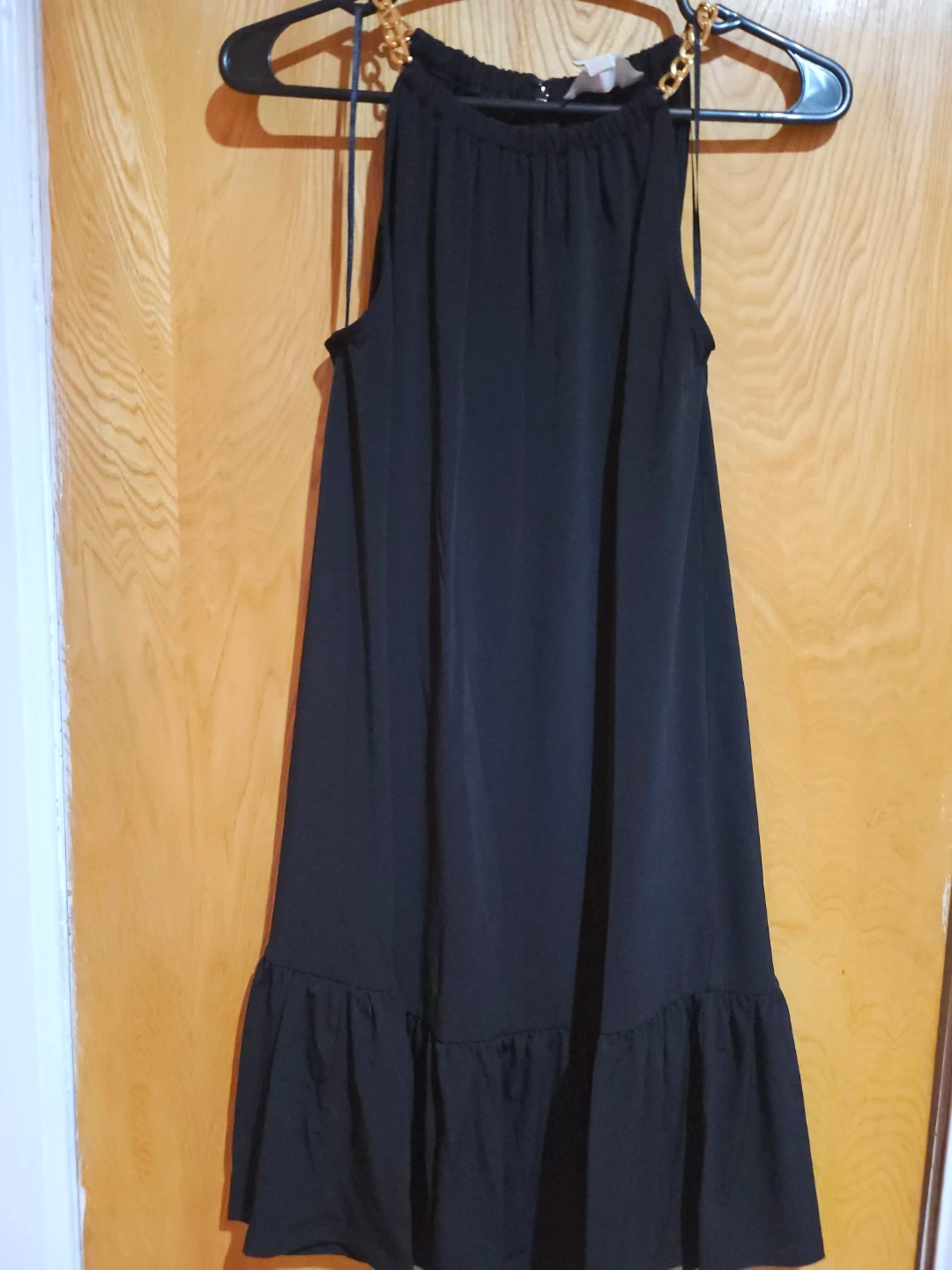 Michael Kors black sleeveless dress with gold chain detail at the neckline. It's a size small. Features a ruffled hem. Perfect for a night out!