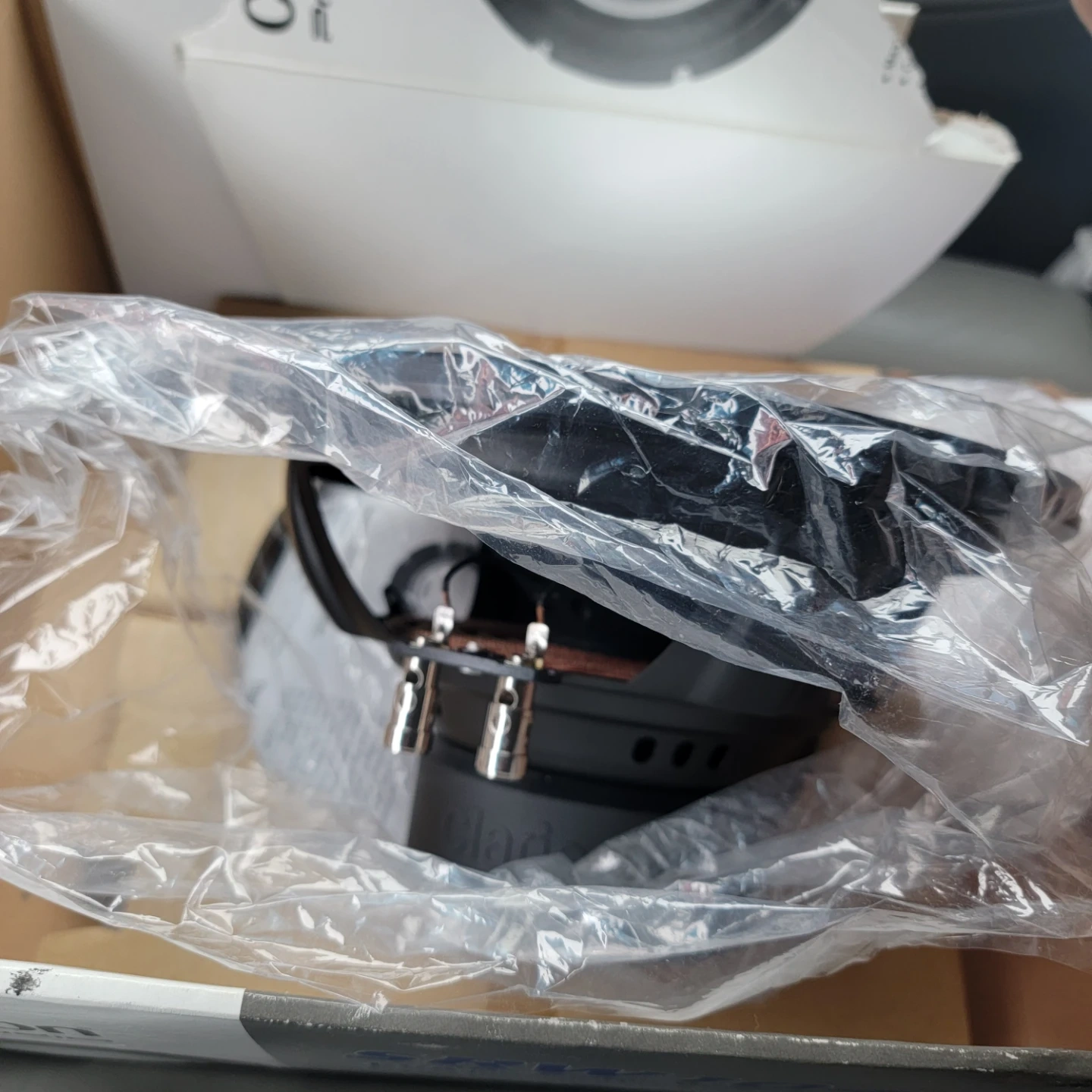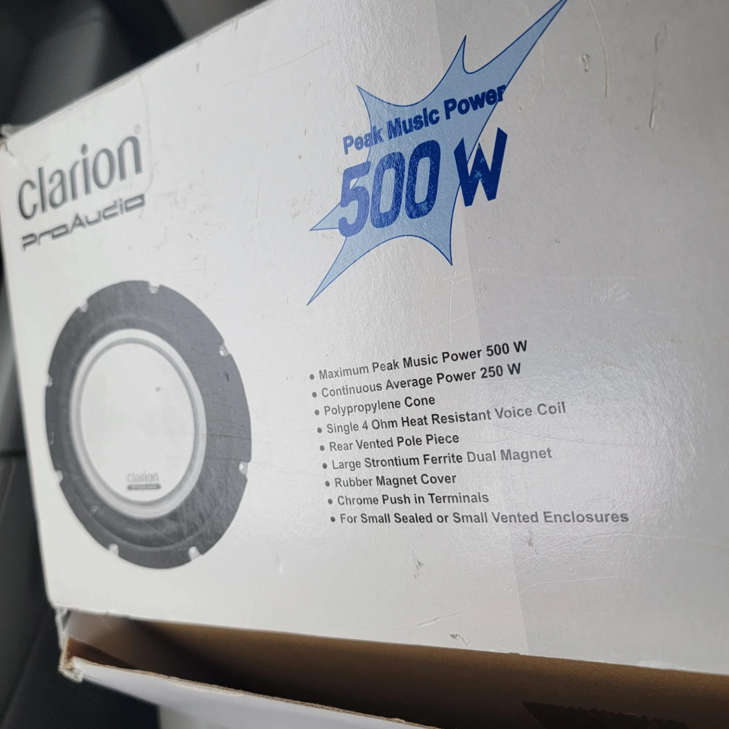 Clarion 10-inch subwoofer with 500W peak music power. Features a polypropylene cone and single voice coil. It has a large strontium ferrite dual magnet and rubber magnet cover. Includes chrome push-in terminals.
