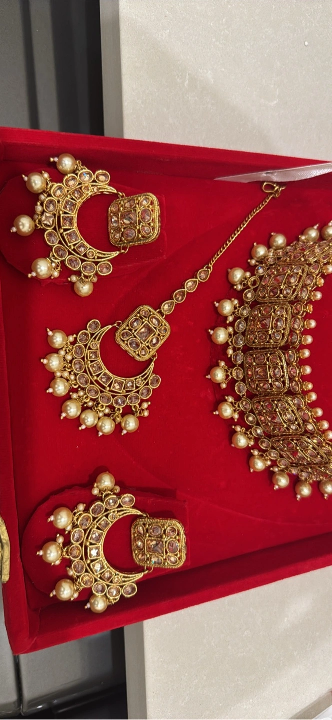 This jewelry set includes earrings, a necklace, and a maang tikka, all in a matching design with pearls and stones. Perfect for a wedding or special occasion! Worn just once on my wedding day