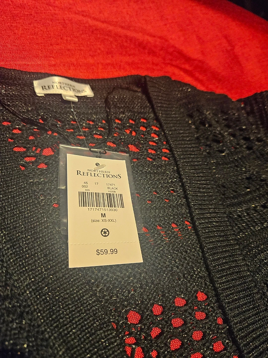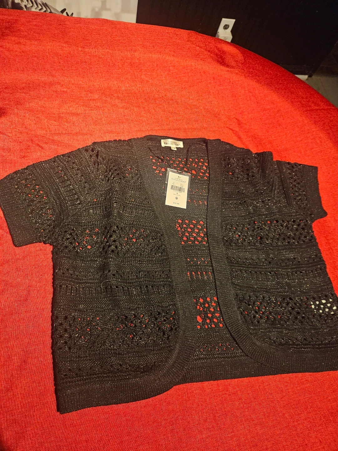 This is a black, short-sleeved crocheted cardigan from Northern Reflections. It's a size medium and features a beautiful open-knit design with some subtle shimmer. It comes with original tags attached.