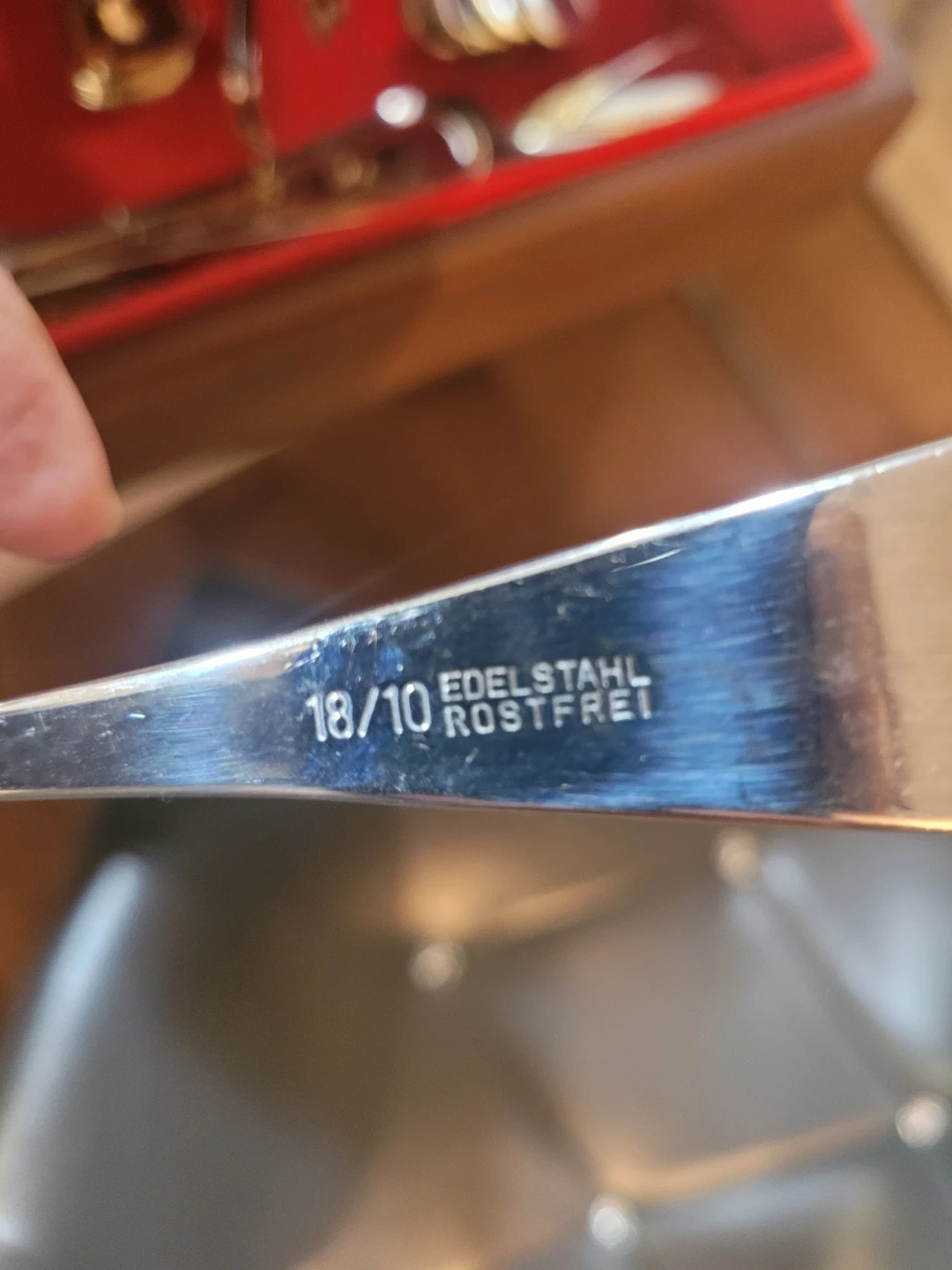 A beautiful 18/10 stainless steel cutlery set. It's housed in a rich red velvet-lined wooden case, perfect for special occasions or everyday elegance. This is,Made in Germany. rustproof stainless steel.
