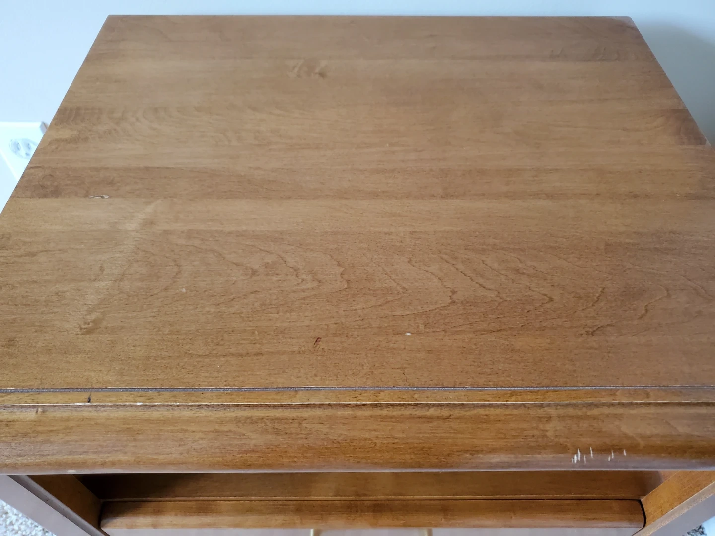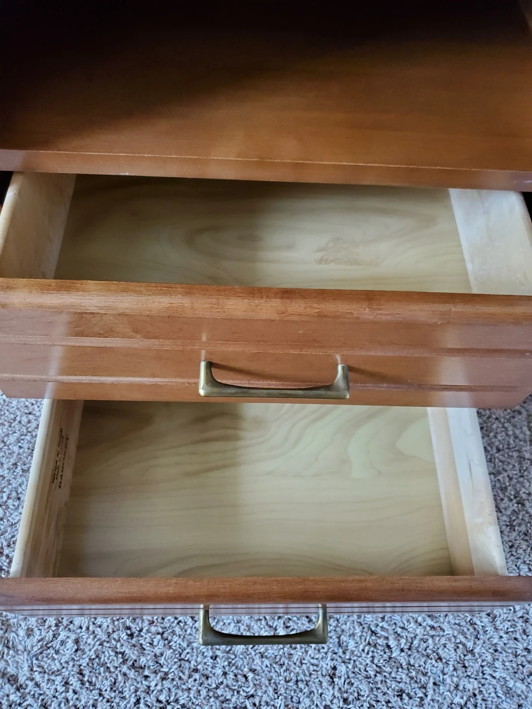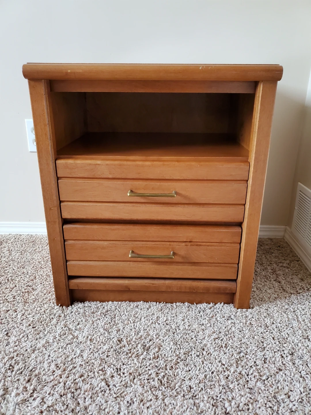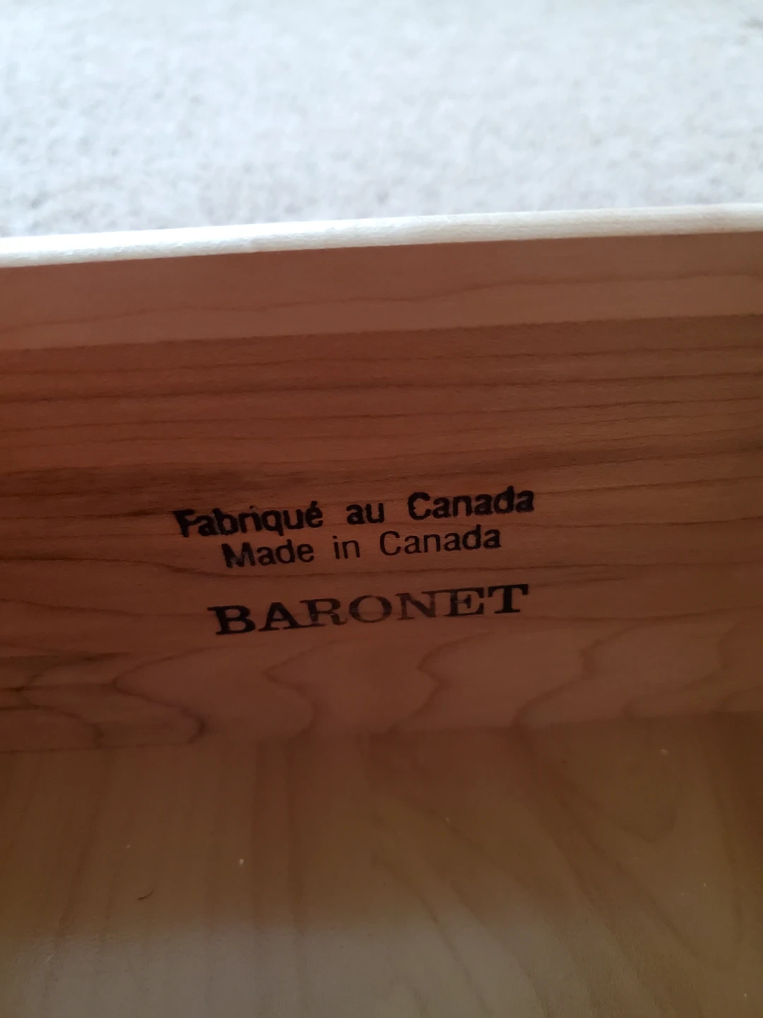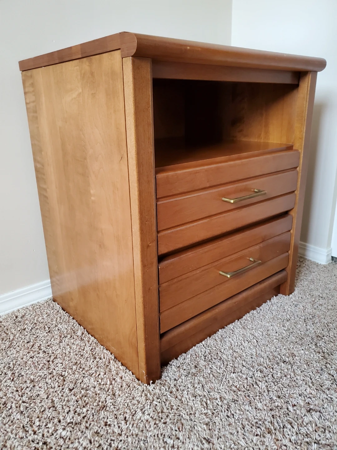 Vintage Baronet nightstand. It has one open shelf and two drawers for storage. Drawers have brass handles. Some minor wear from use over the years. High quality, solid wood. Made in Canada. 20" L x 17" W x 23" H.