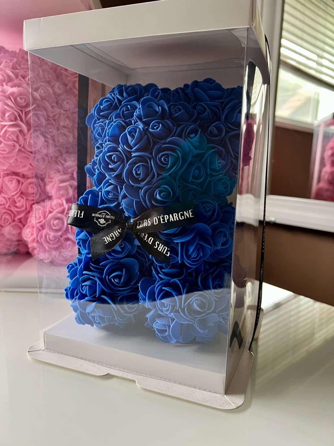This is a pink large and blue small rose bear. It's made of artificial foam roses. It comes in a clear display box with a ribbon.