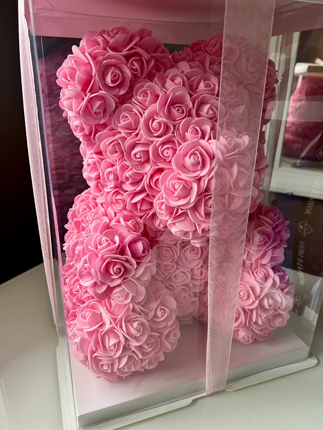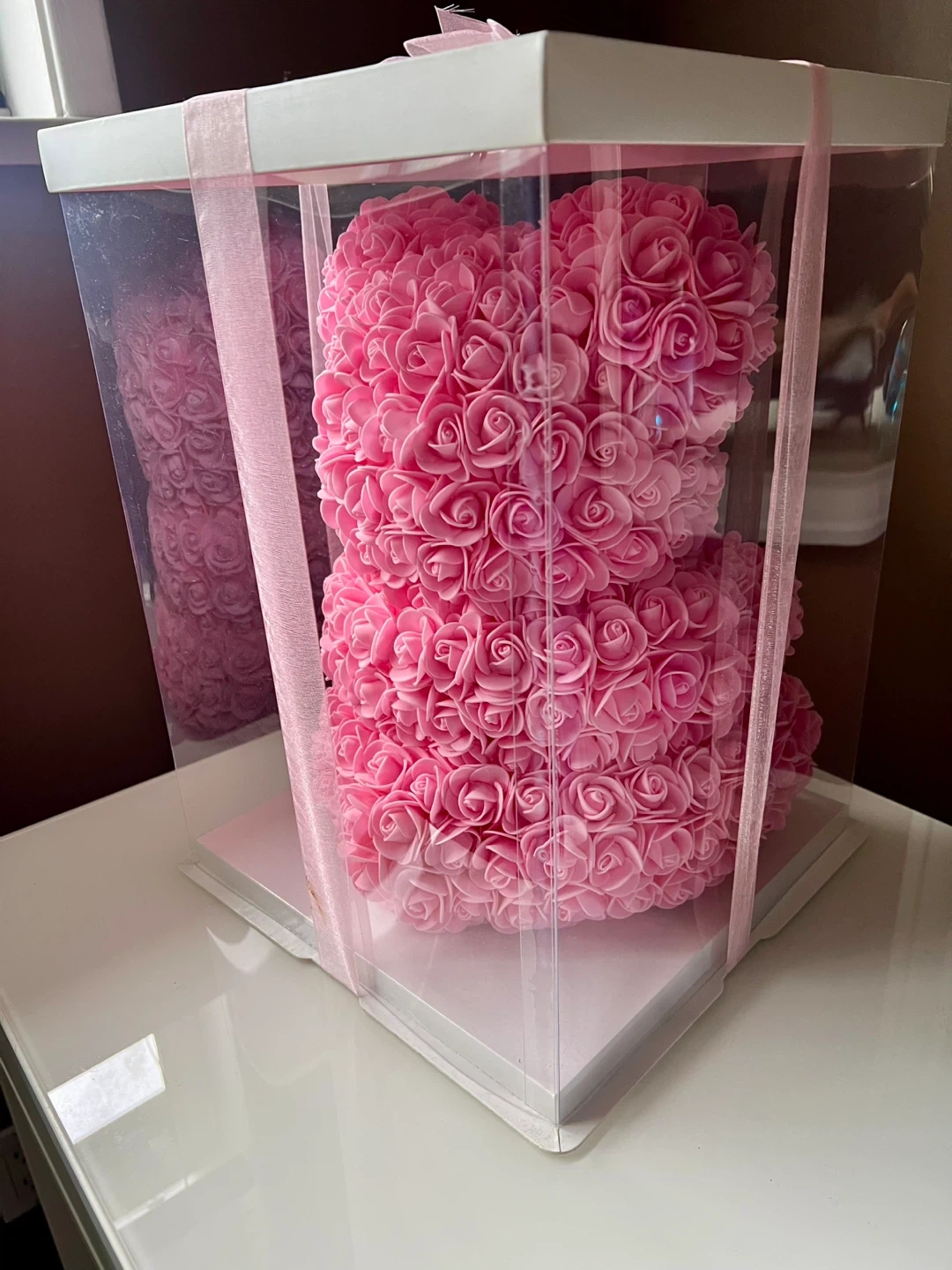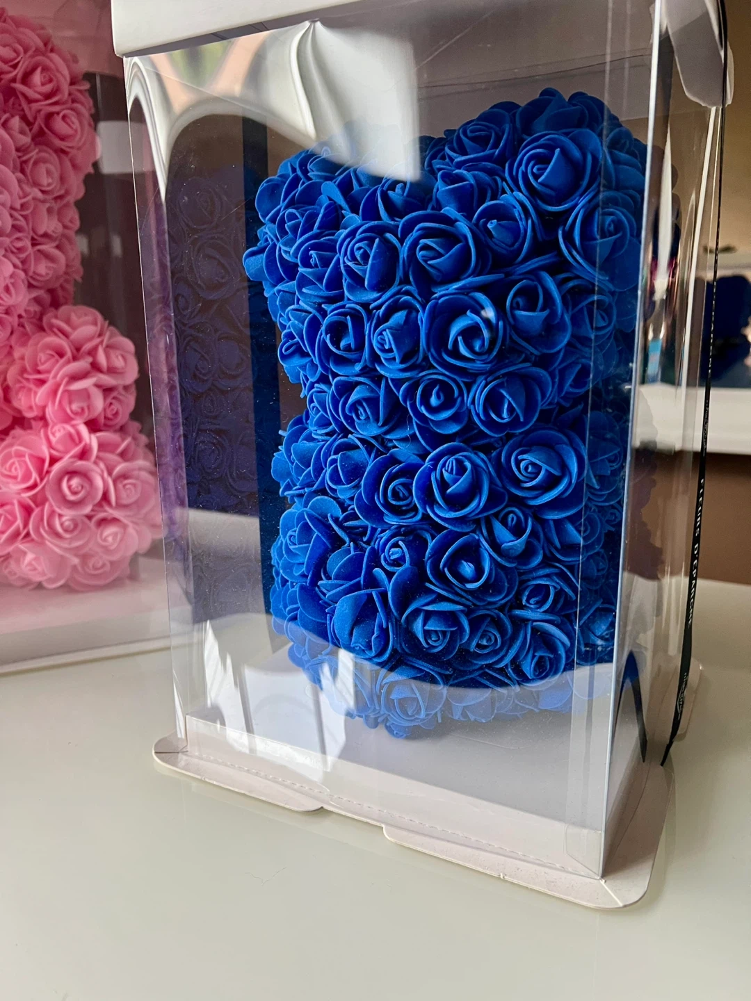 This is a pink large and blue small rose bear. It's made of artificial foam roses. It comes in a clear display box with a ribbon.