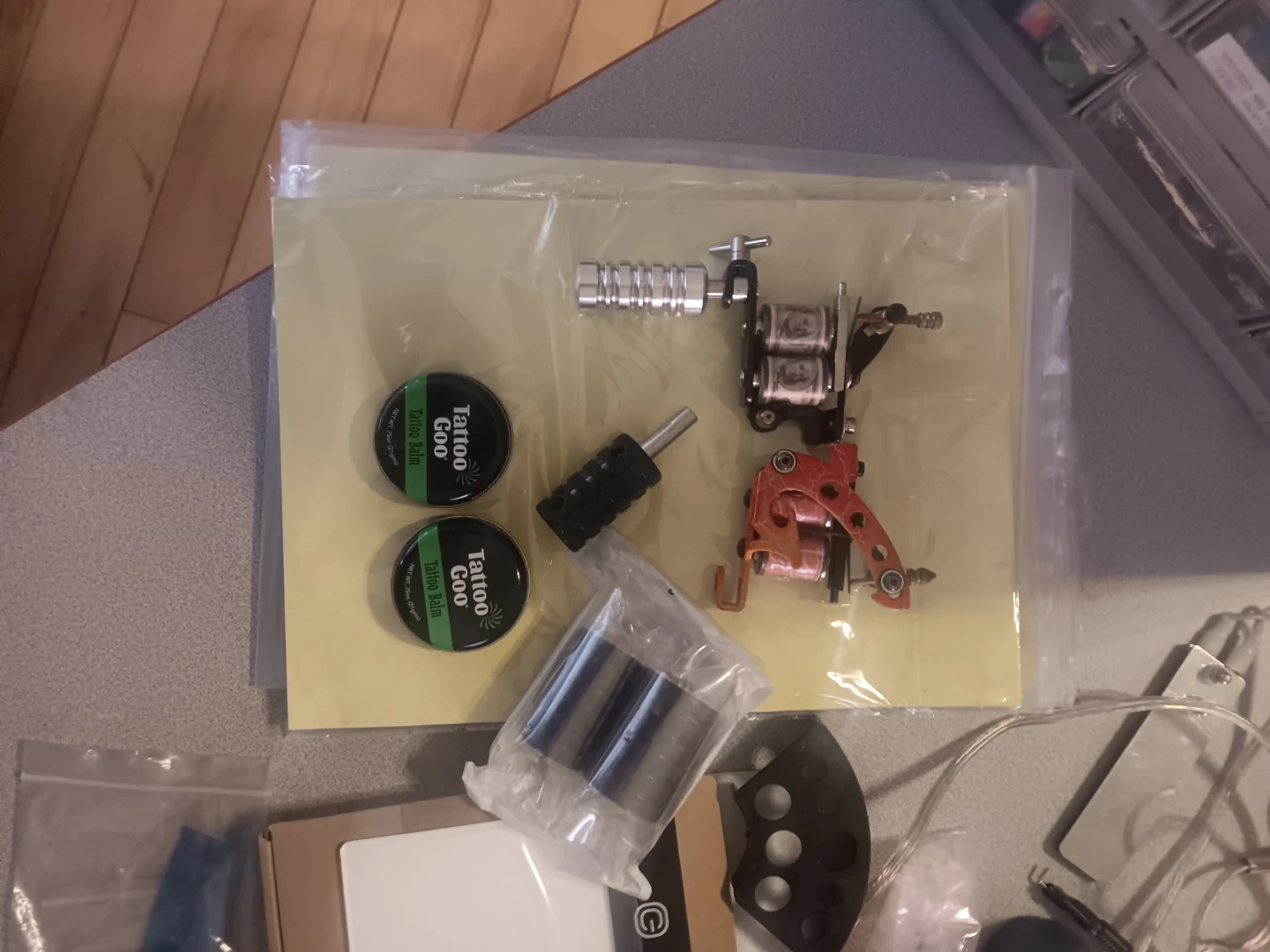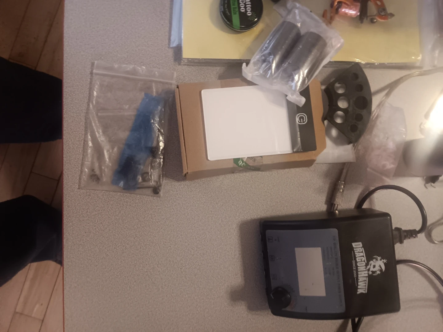 This kit includes a Dragonhawk tattoo power supply, two tattoo guns, several cartridges, and 1 Tattoo Goo balm. It's suitable for tattoo artists starting out or for practice. All items shown are included in this bundle.