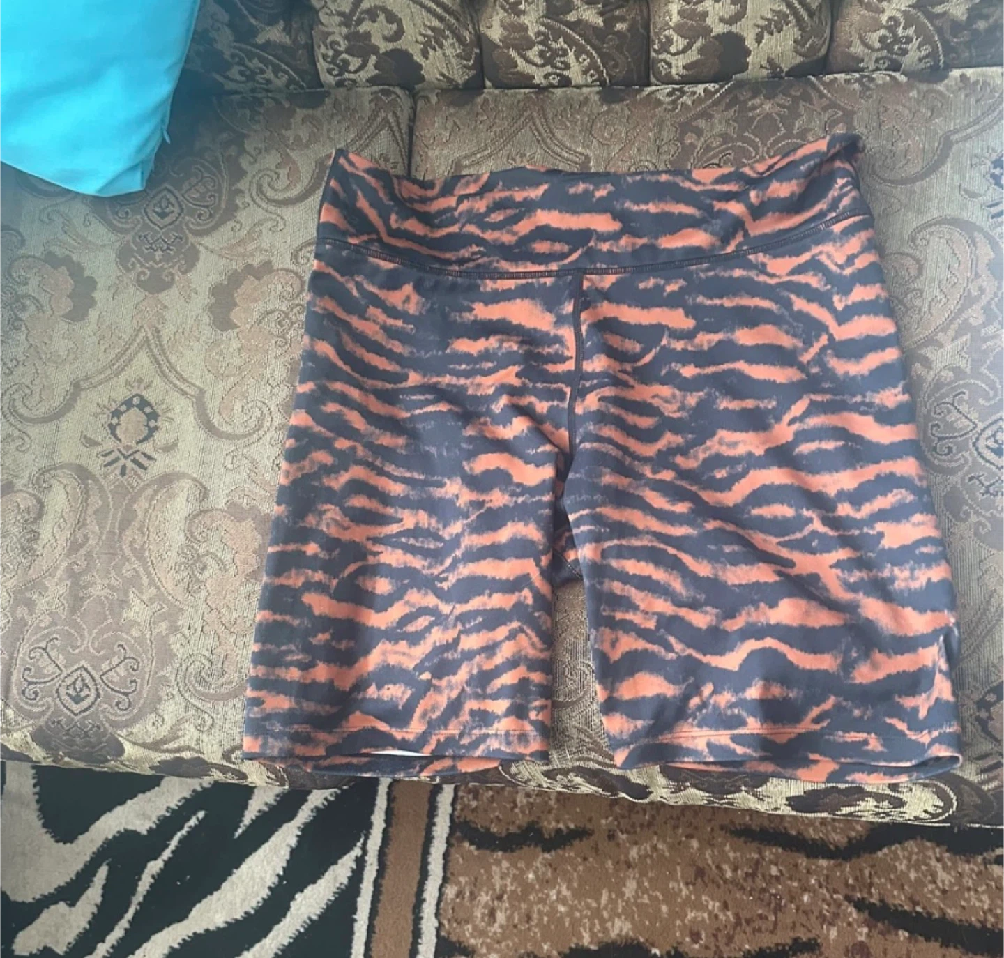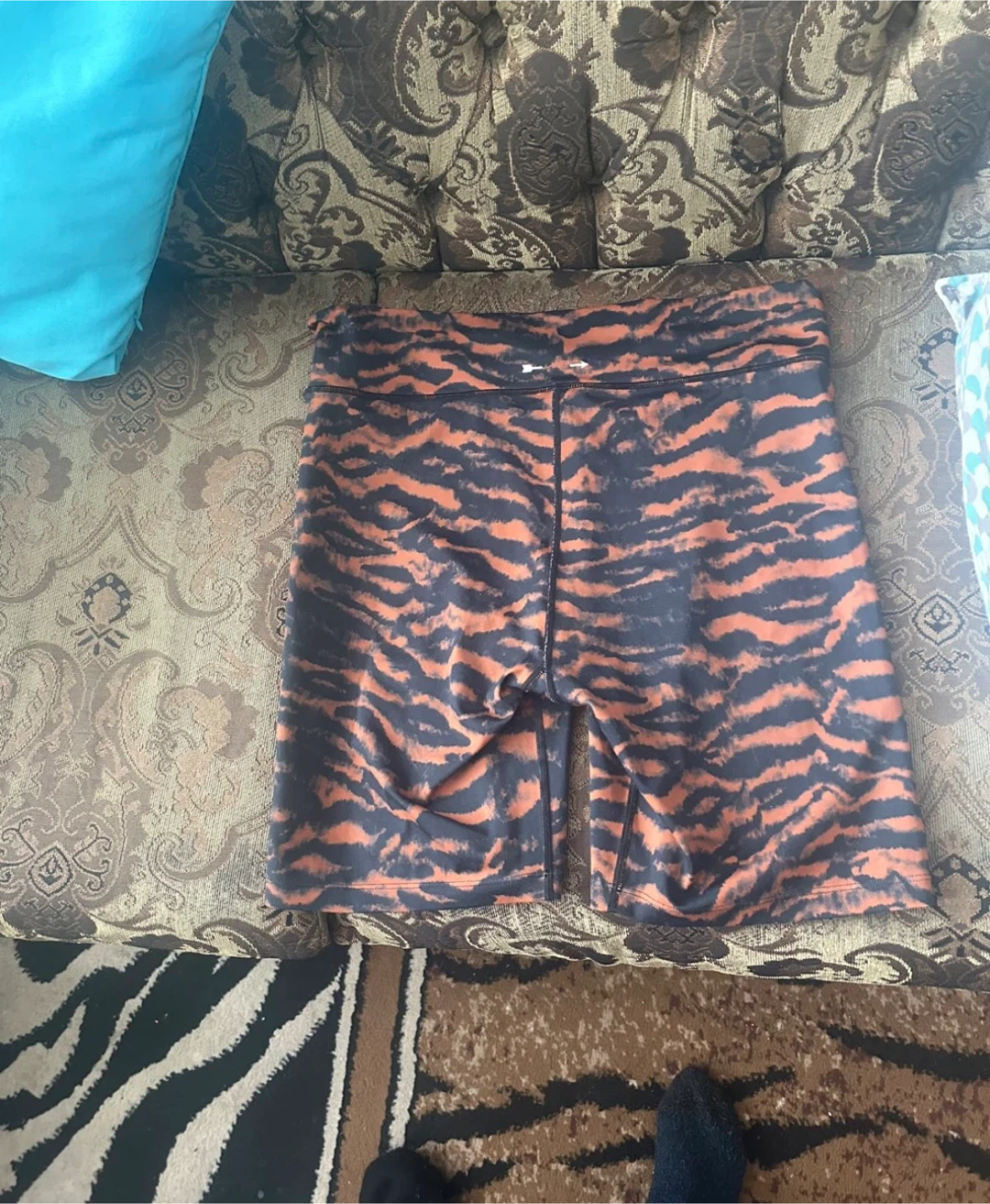 These bike shorts from The Upside feature a cool tiger print! They are a size XL and made of a comfy blend of nylon and elastane.