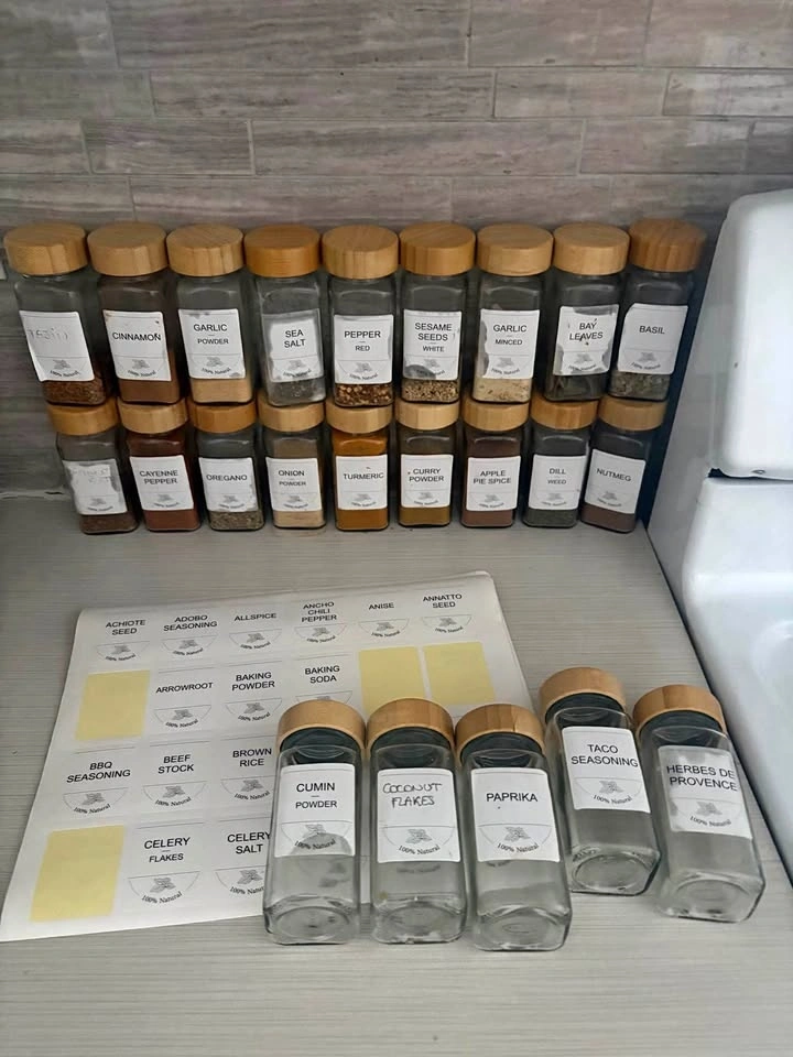 Beautiful, cohesive spice jar set for an organized kitchen aesthetic. Includes multiple glass jars with bamboo lids, pre-printed labels, and extra blank labels. Some jars are filled, and some are empty as shown. Selling as a full set only. The jars are clean with no cracks. Pickup only.