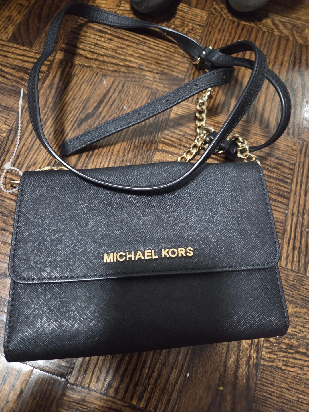 Michael Kors black pebbled leather crossbody wallet with a gold chain strap. It has a fold-over flap with a snap closure. Interior includes card slots and a zip pocket.