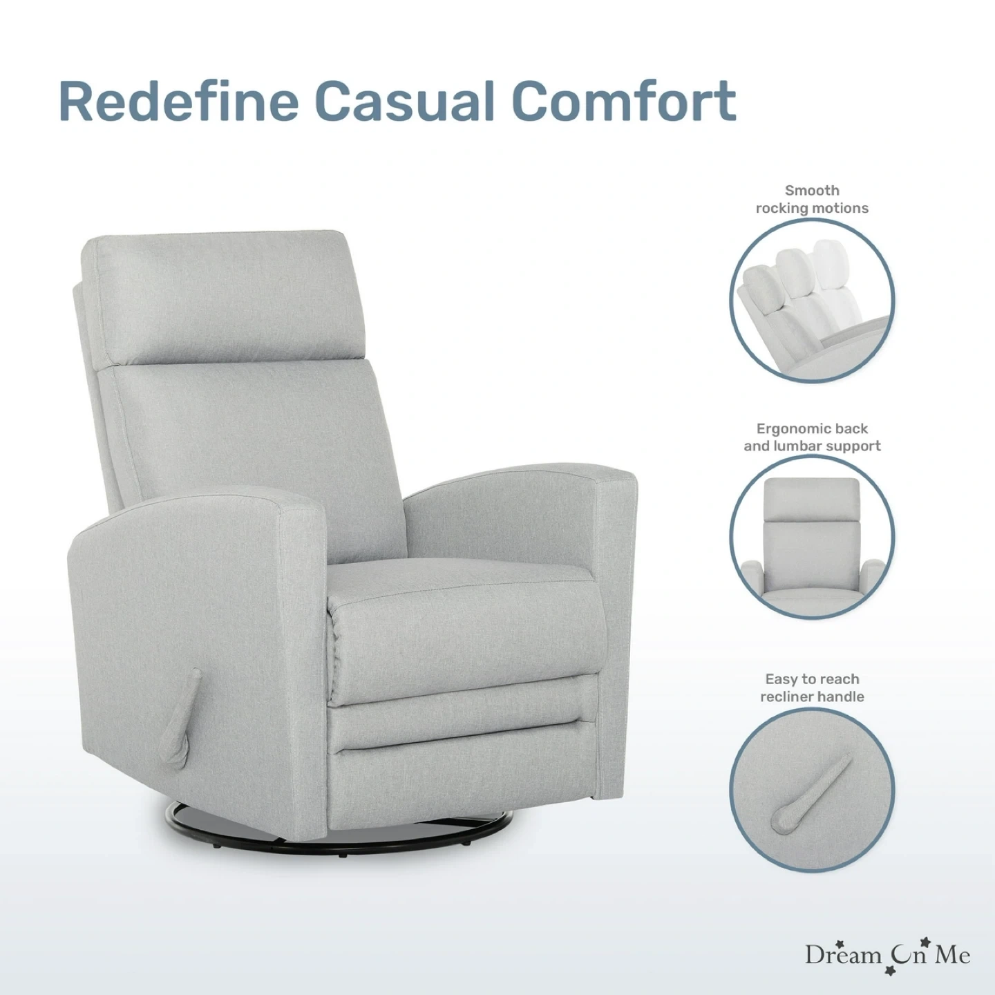This Dream On Me Chatham Glider Recliner offers 3-in-1 functionality with smooth rocking motions and 360° swivel. It features ergonomic back and lumbar support for maximum comfort. The easy-to-reach recliner handle makes adjustments a breeze.