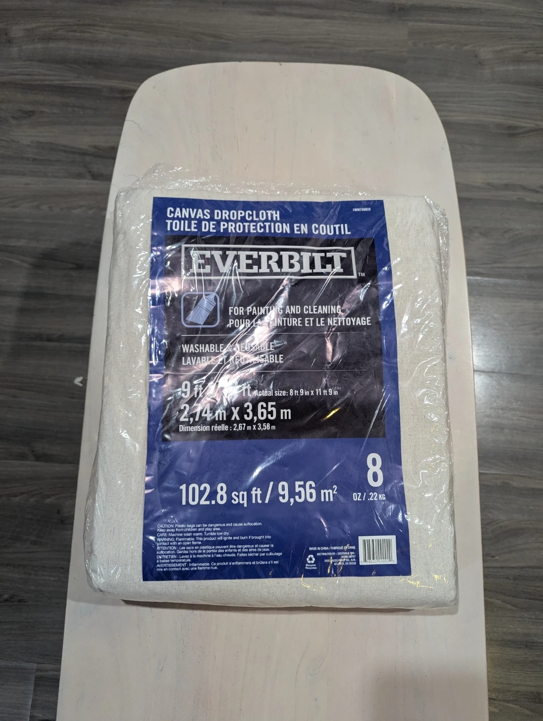This Everbilt canvas dropcloth is washable and reusable. It's 8 ft 9 in x 11 ft 9 in and provides 102.8 sq ft of coverage. It's suitable for painting and cleaning tasks.