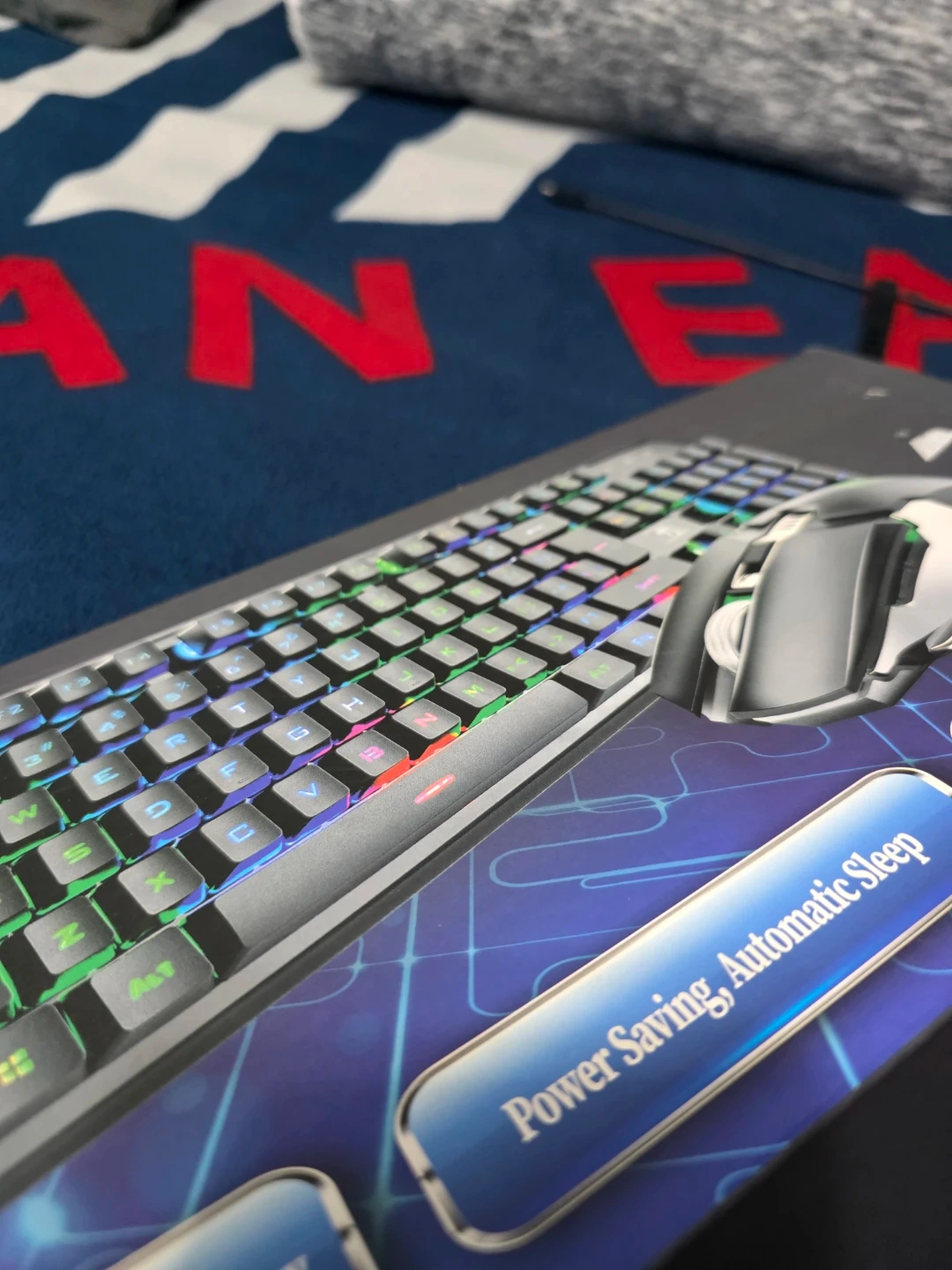 This is a gaming keyboard and mouse set with customizable RGB lighting. It features power saving and automatic sleep functions. The keyboard has a standard layout with responsive keys.