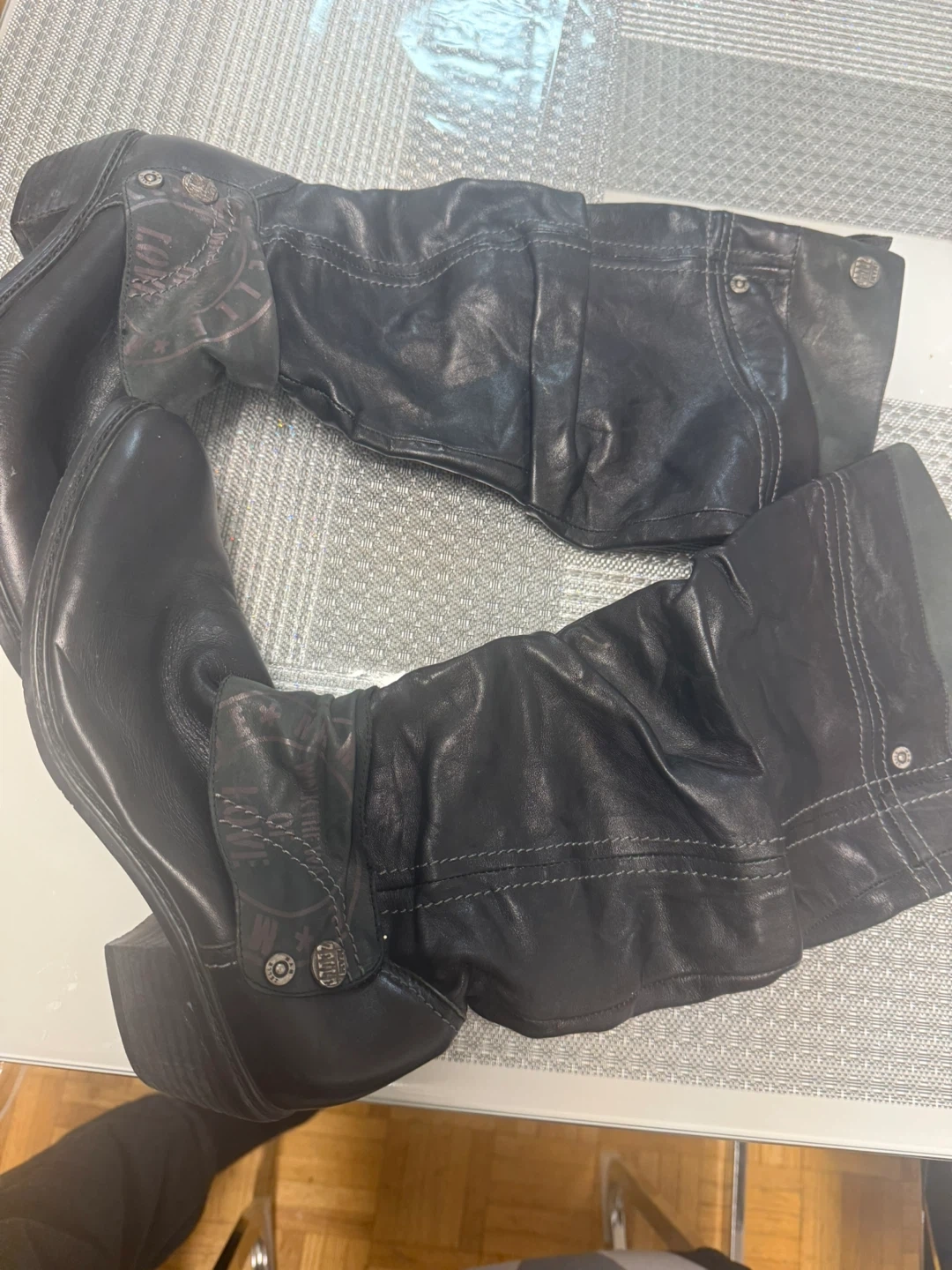 Elle knee-high black leather boots in size 9 (marked as 39 on the sole). These boots have a stylish, slightly worn look and are ready for a new adventure!
