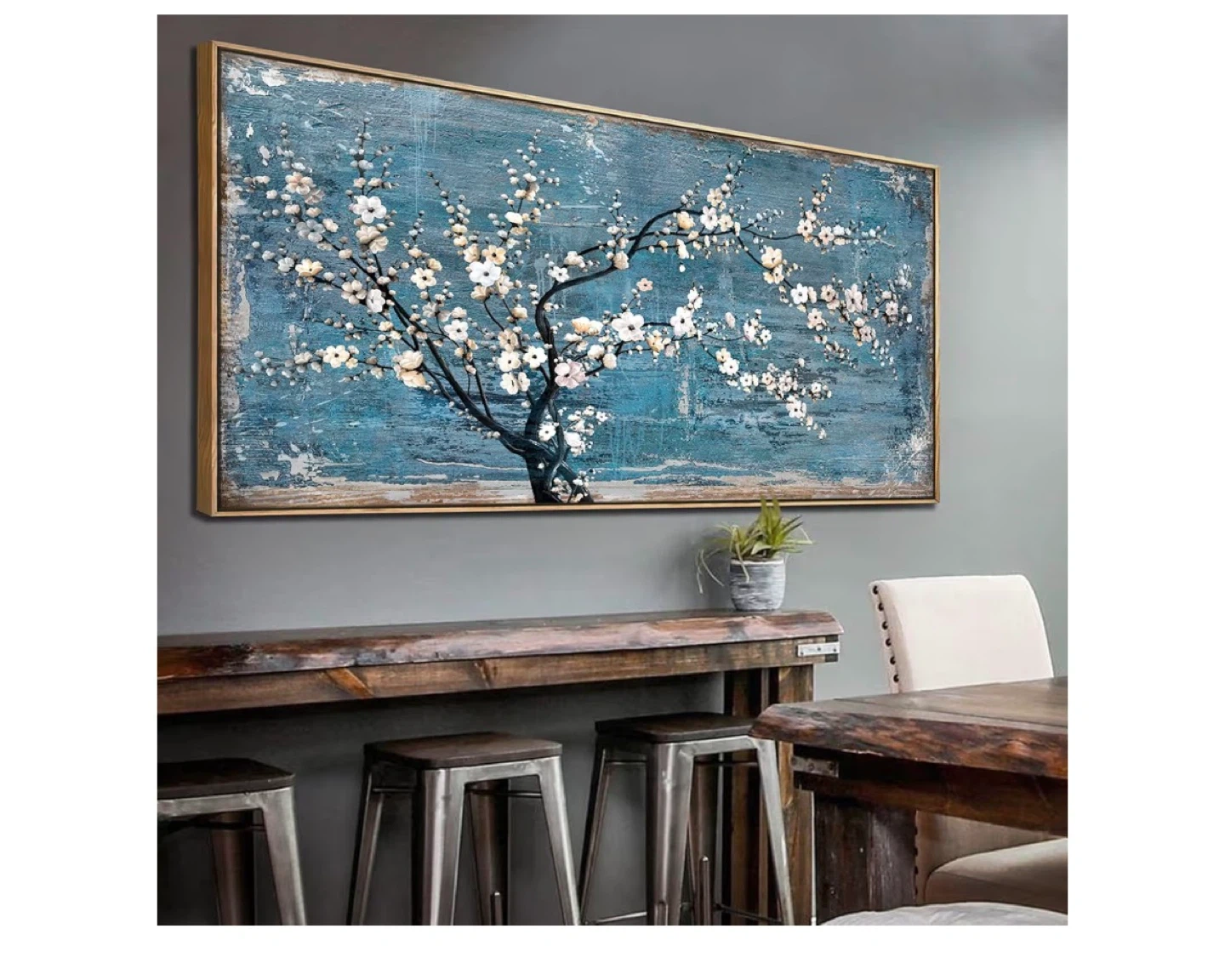 This framed artwork depicts a tree with white blossoms against a textured blue background. Canvas material with a gold-tone frame. Size is 100L x 50W cm.
