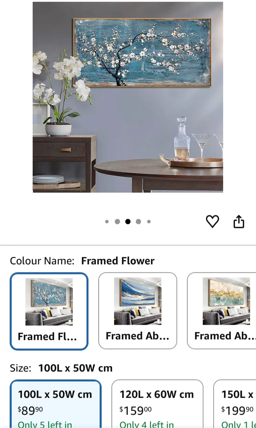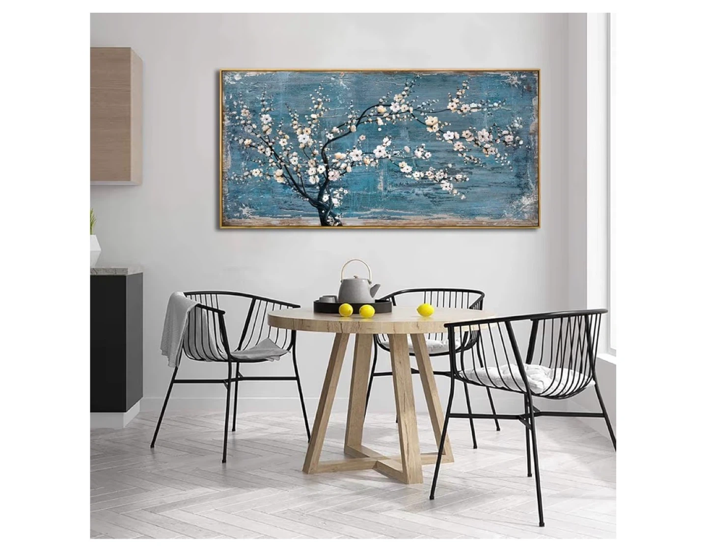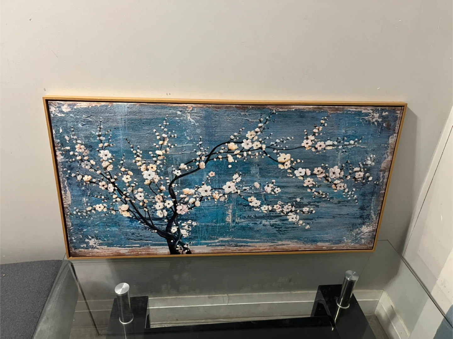 This framed artwork depicts a tree with white blossoms against a textured blue background. Canvas material with a gold-tone frame. Size is 100L x 50W cm.