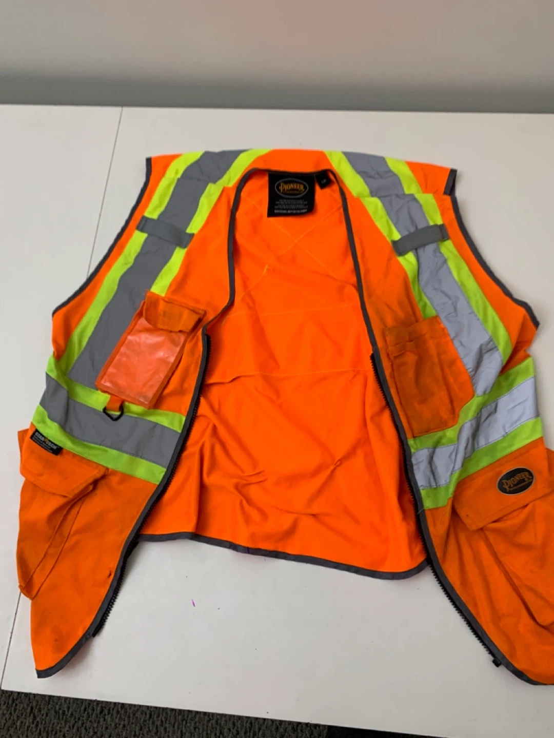 This Pioneer high-visibility safety vest is orange with reflective stripes. It's a size L/G. It meets CSA Z96-15 Class 2 Level 2 and ANSI/ISEA 107-15 Class 2 Type P & R standards. This vest is designed for enhanced visibility and safety.