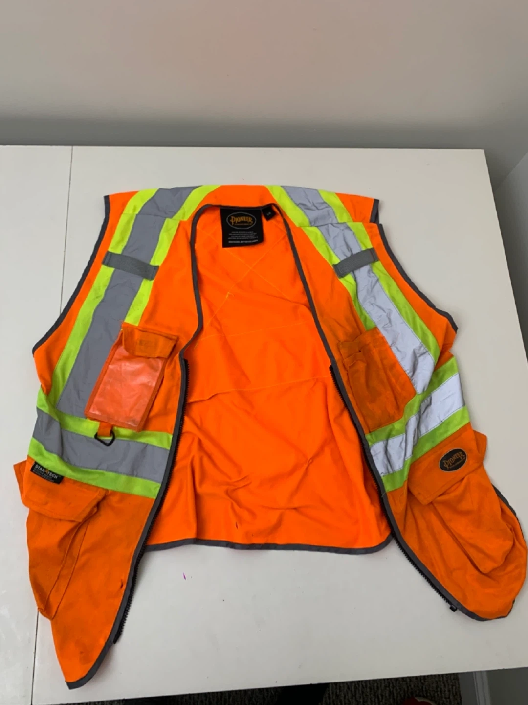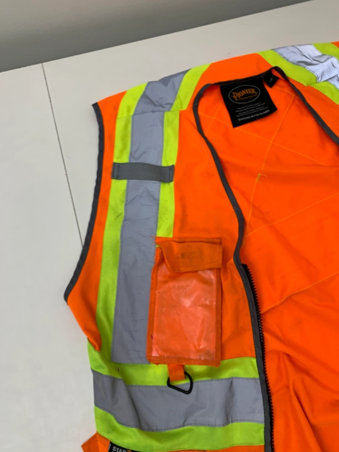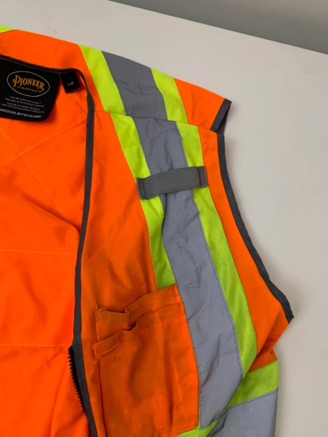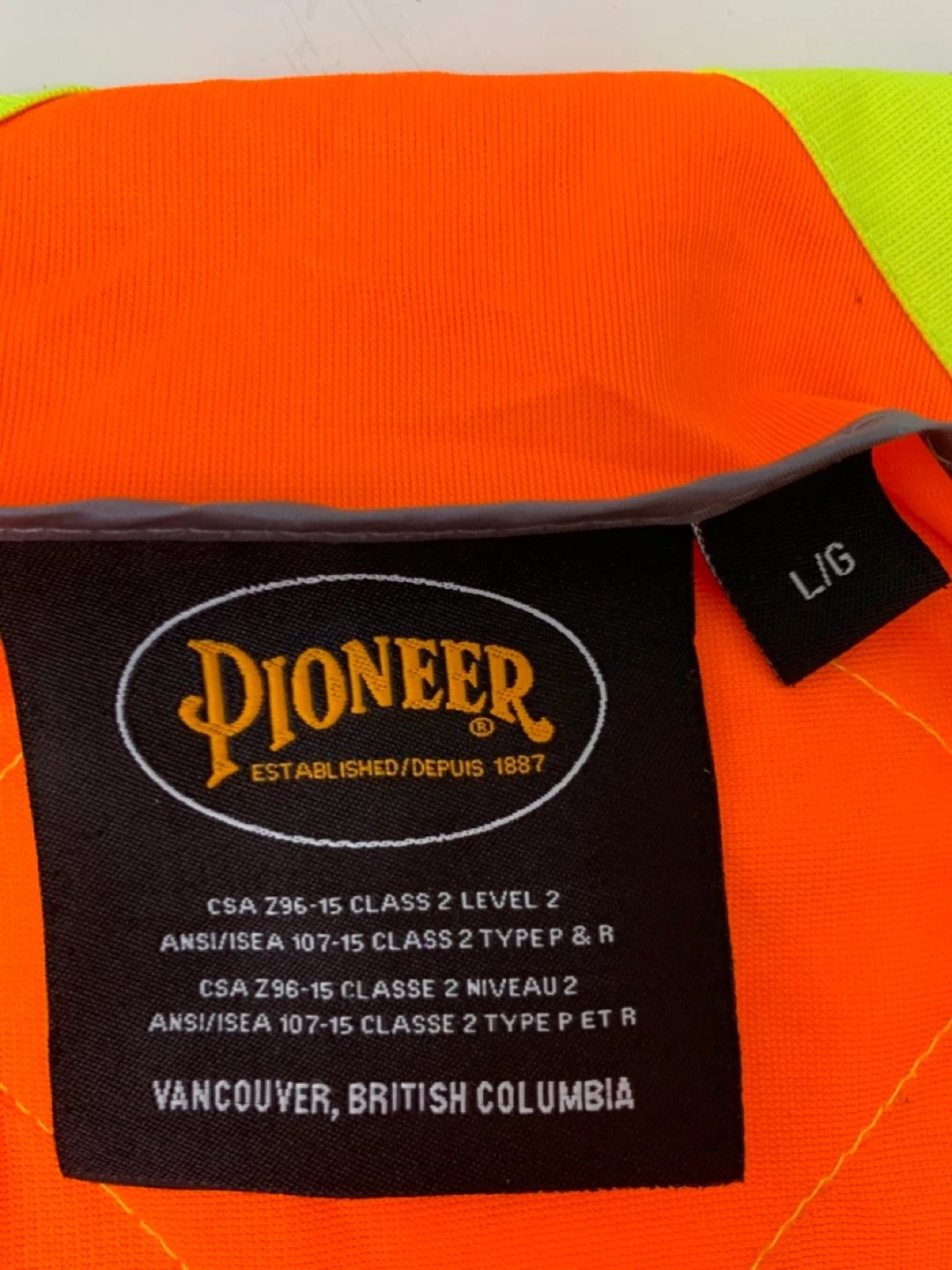This Pioneer high-visibility safety vest is orange with reflective stripes. It's a size L/G. It meets CSA Z96-15 Class 2 Level 2 and ANSI/ISEA 107-15 Class 2 Type P & R standards. This vest is designed for enhanced visibility and safety.