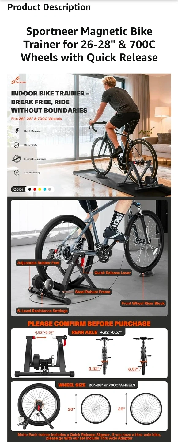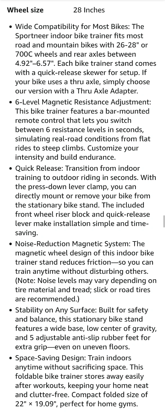 Designed for 26-28" and 700C wheels, this trainer features an adjustable 6-level resistance, quick release lever, and front wheel riser block. π΄ββοΈπͺ