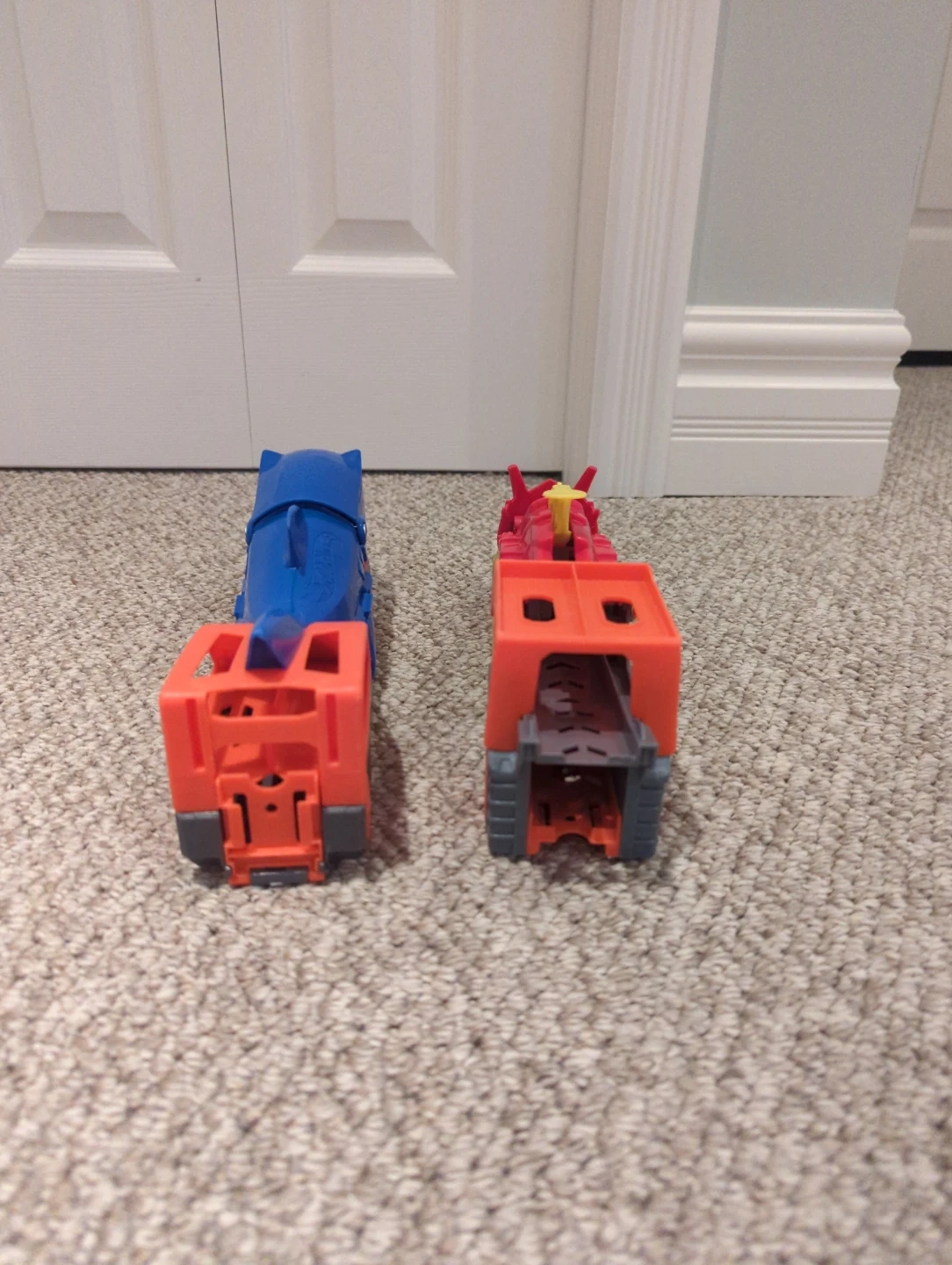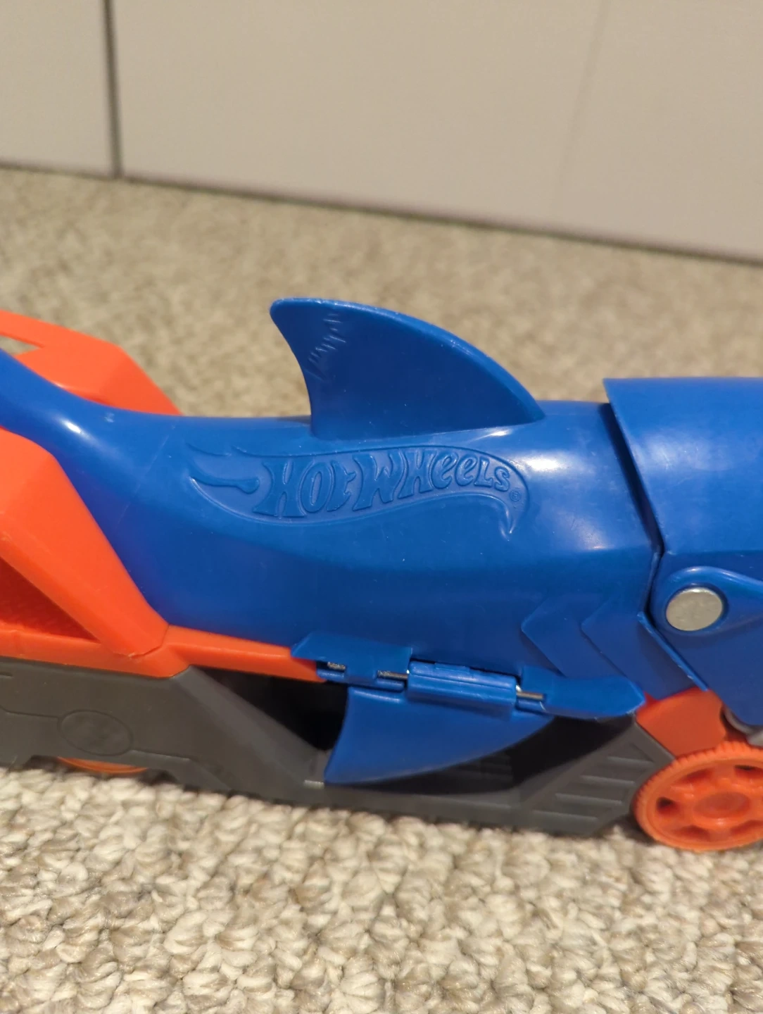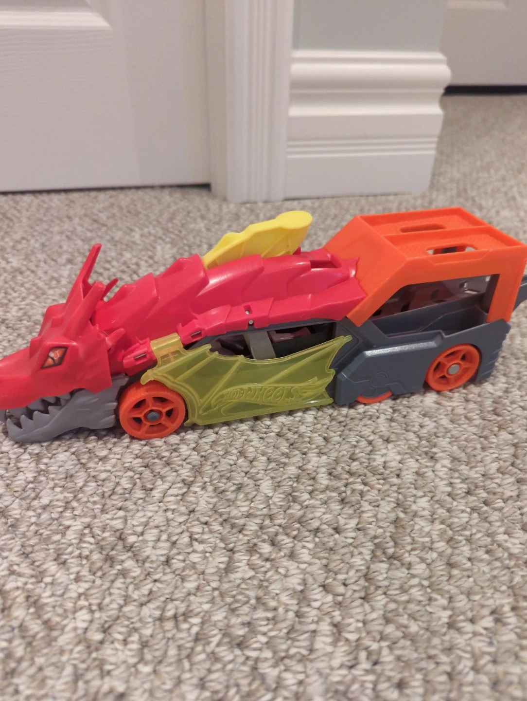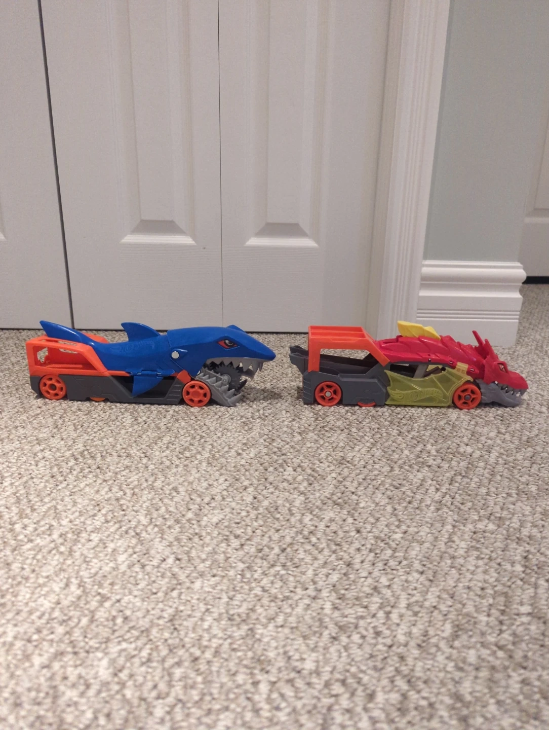 Selling a pair of Hot Wheels cars! One is a Sharkruiser (blue and orange) and the other is a Dragon Blaster (red and orange). They're in good condition and ready for a new adventure!