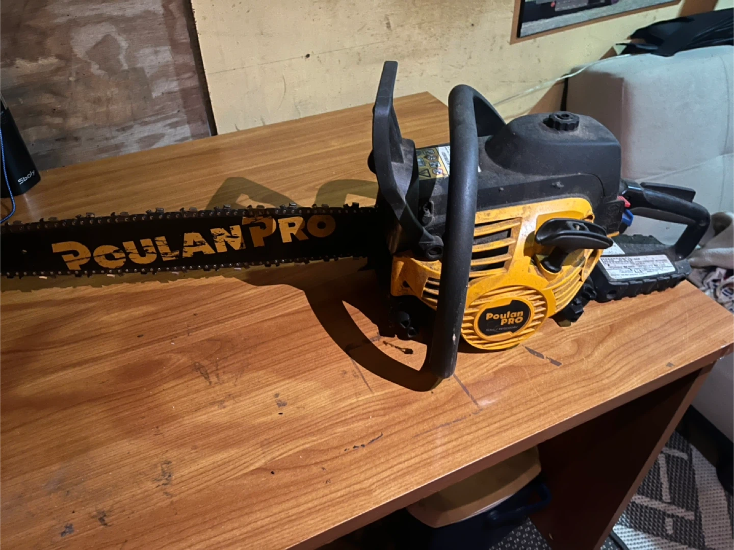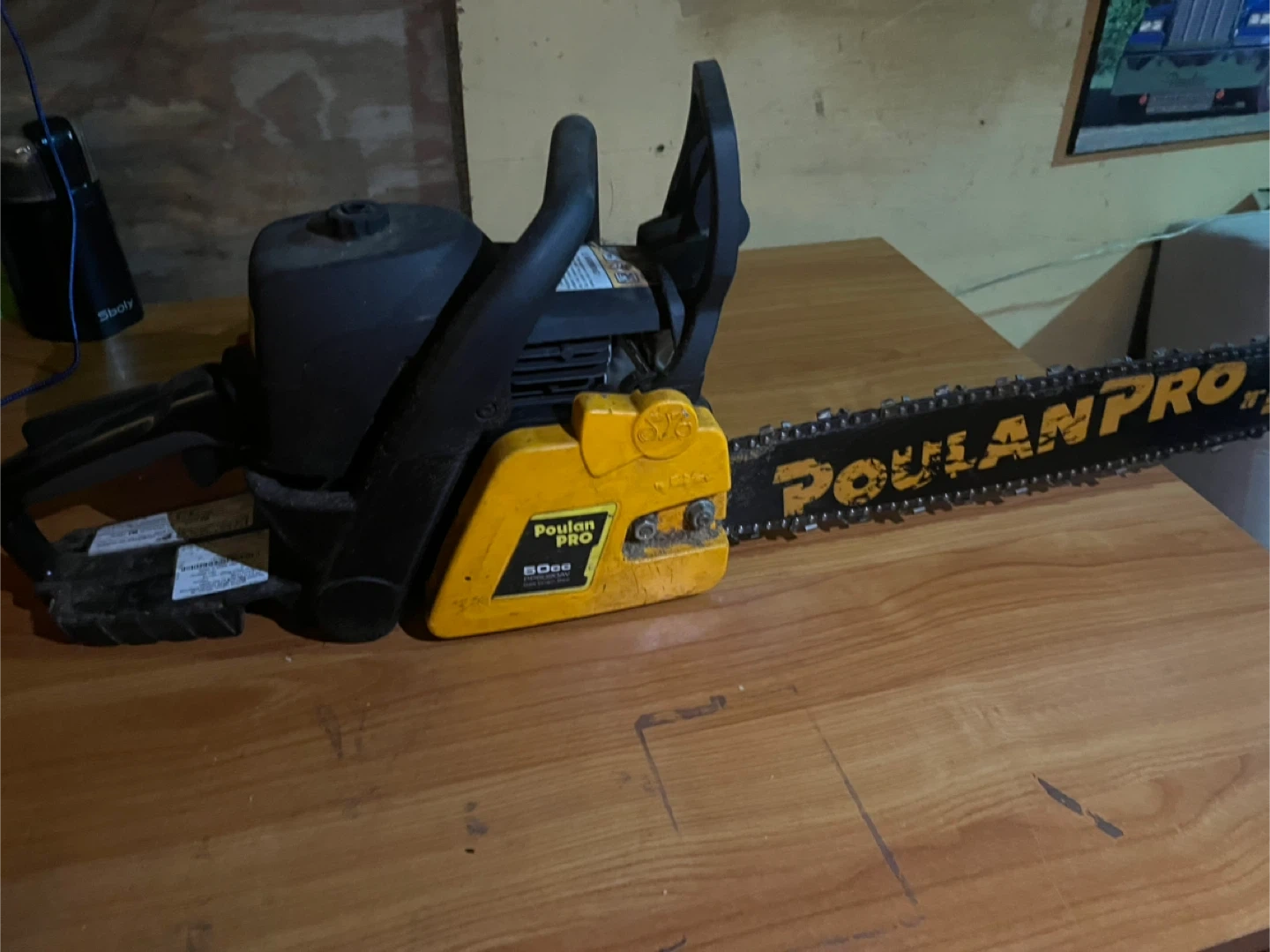 This Poulan Pro gas chain saw has a 50cc engine and model number PP5020AV. It's designed for gas power. This saw is useful for various cutting tasks around the yard. Runs… needs a tune up… come with saw gas can with oil reservoir