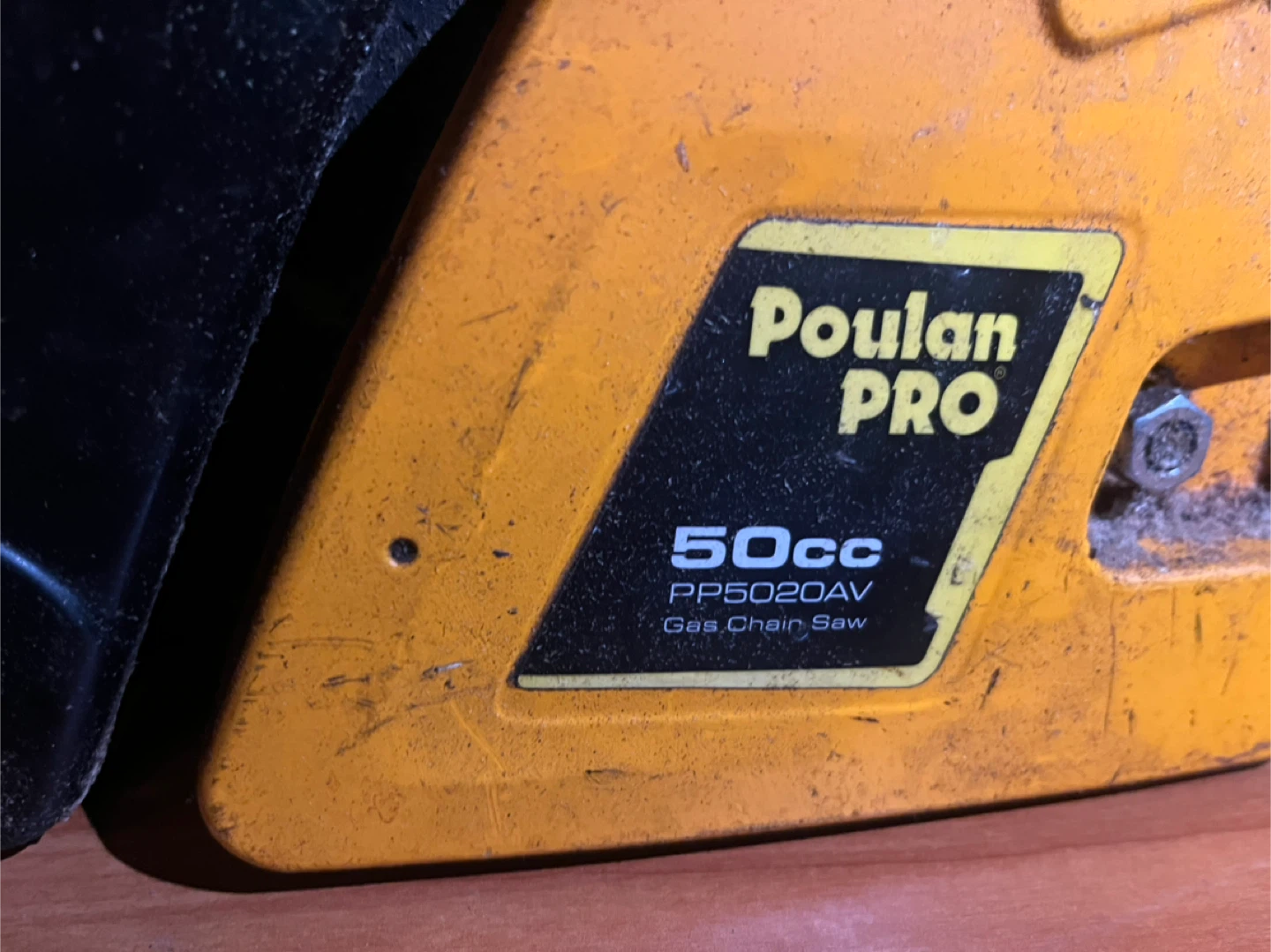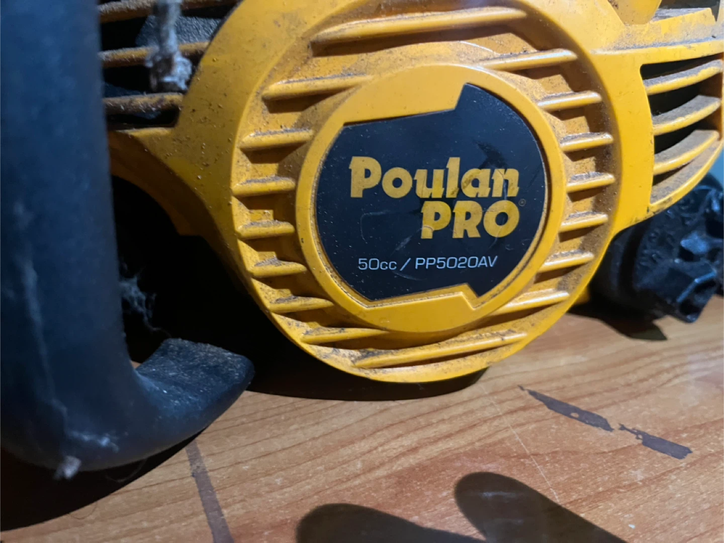 This Poulan Pro gas chain saw has a 50cc engine and model number PP5020AV. It's designed for gas power. This saw is useful for various cutting tasks around the yard. Runs… needs a tune up… come with saw gas can with oil reservoir