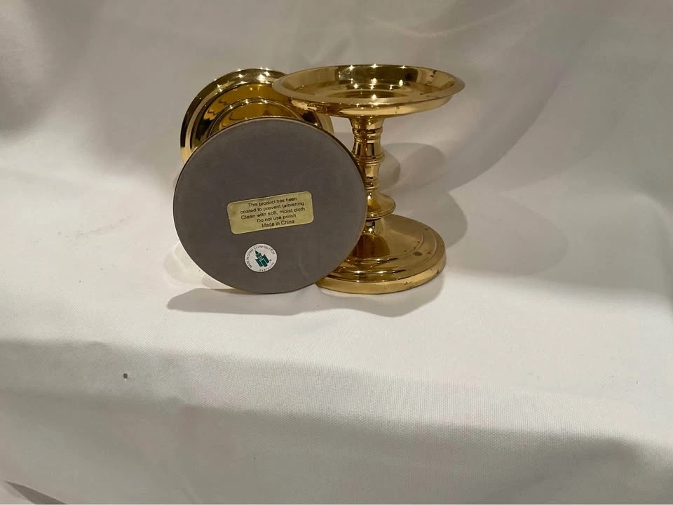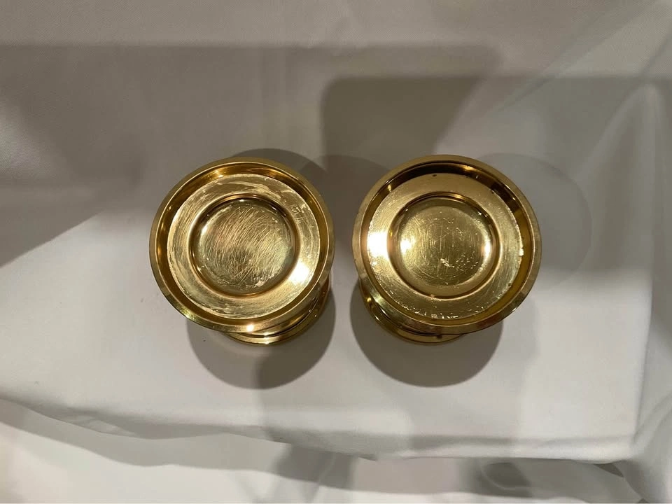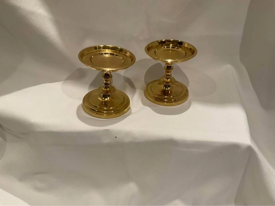 Heavy set of brass candleholders from Partylite. One is showing natural patina, please see picture. Height 4”, Base 3 1/2”. From a smoke & pet free home. Cash Only - Richmond Hill - Bathurst & King Rd.
