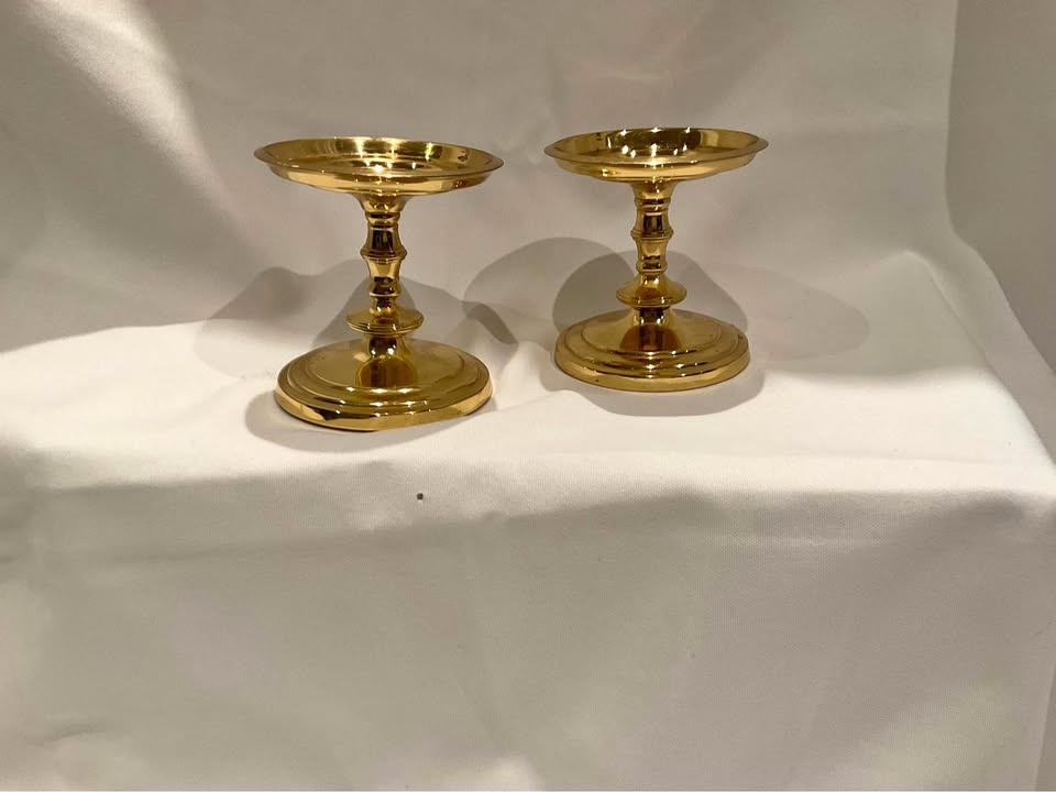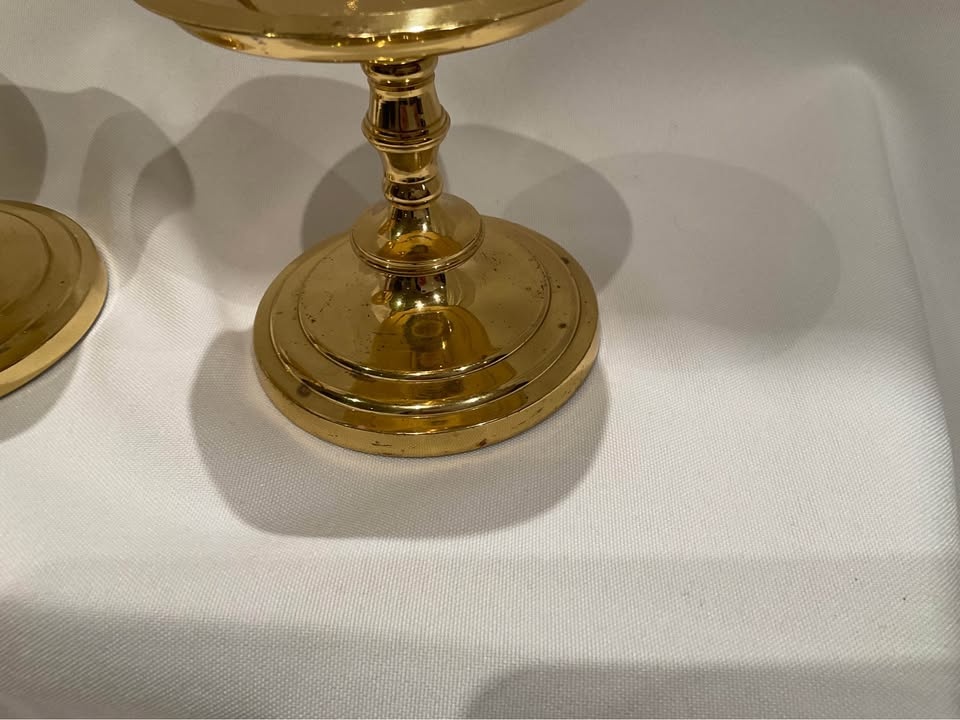 Heavy set of brass candleholders from Partylite. One is showing natural patina, please see picture. Height 4”, Base 3 1/2”. From a smoke & pet free home. Cash Only - Richmond Hill - Bathurst & King Rd.