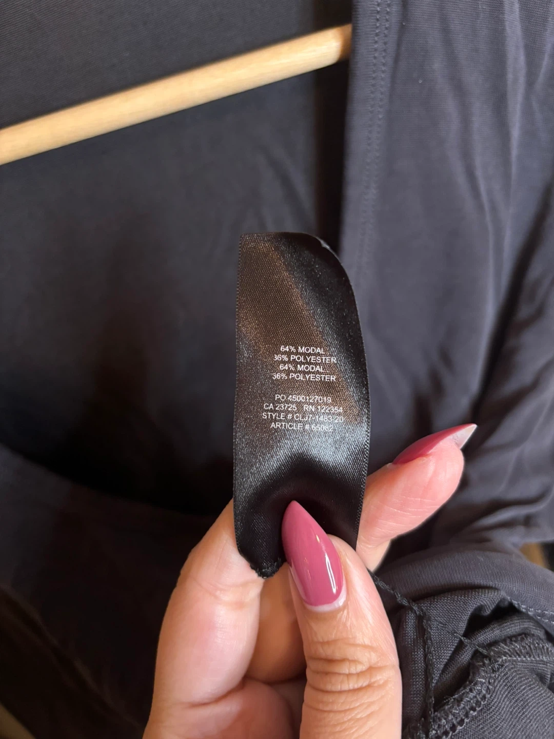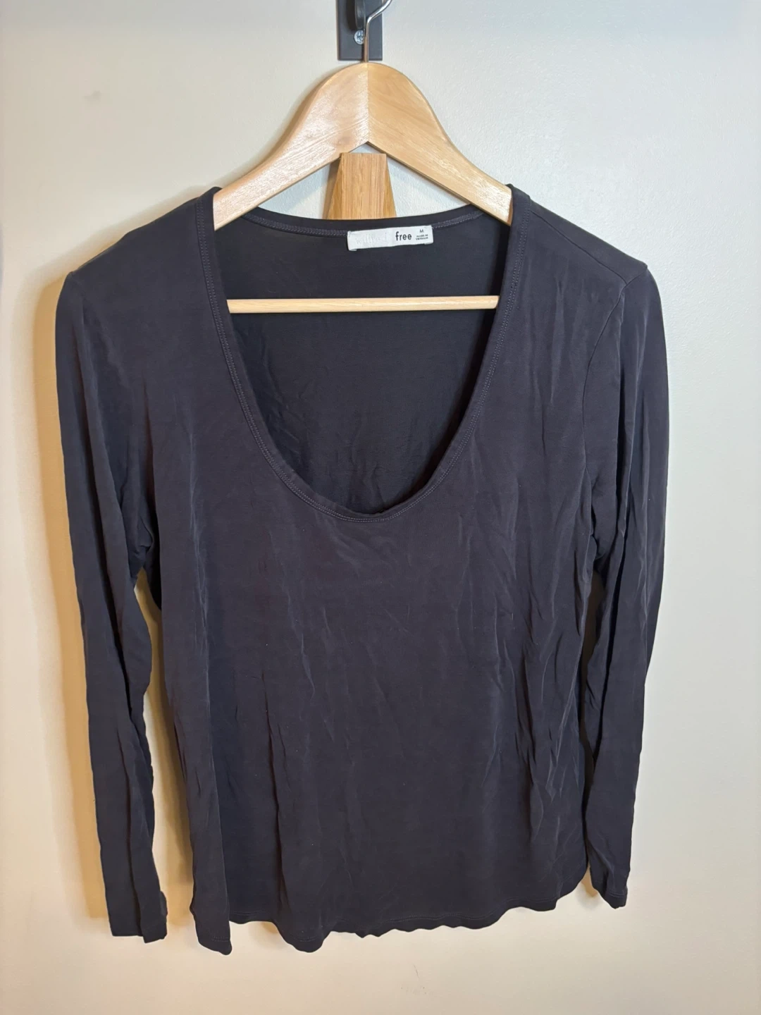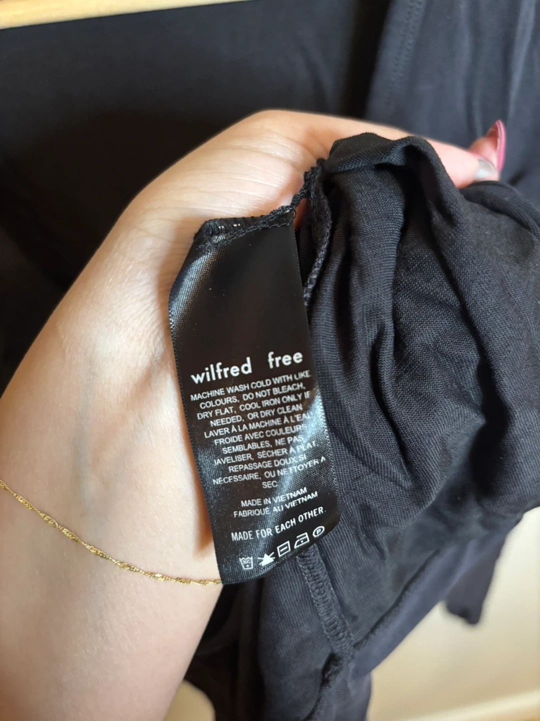 A simple, black long-sleeve top from Wilfred Free! It's a size medium and made in Vietnam. The material is 64% modal and 36% polyester.
