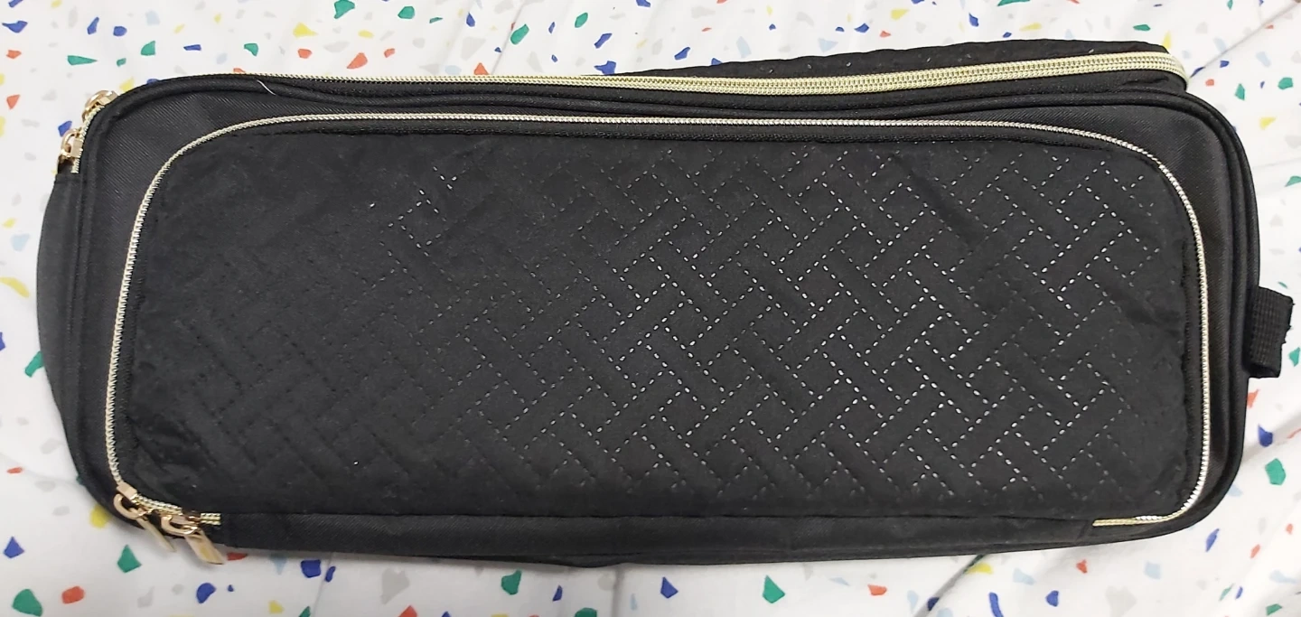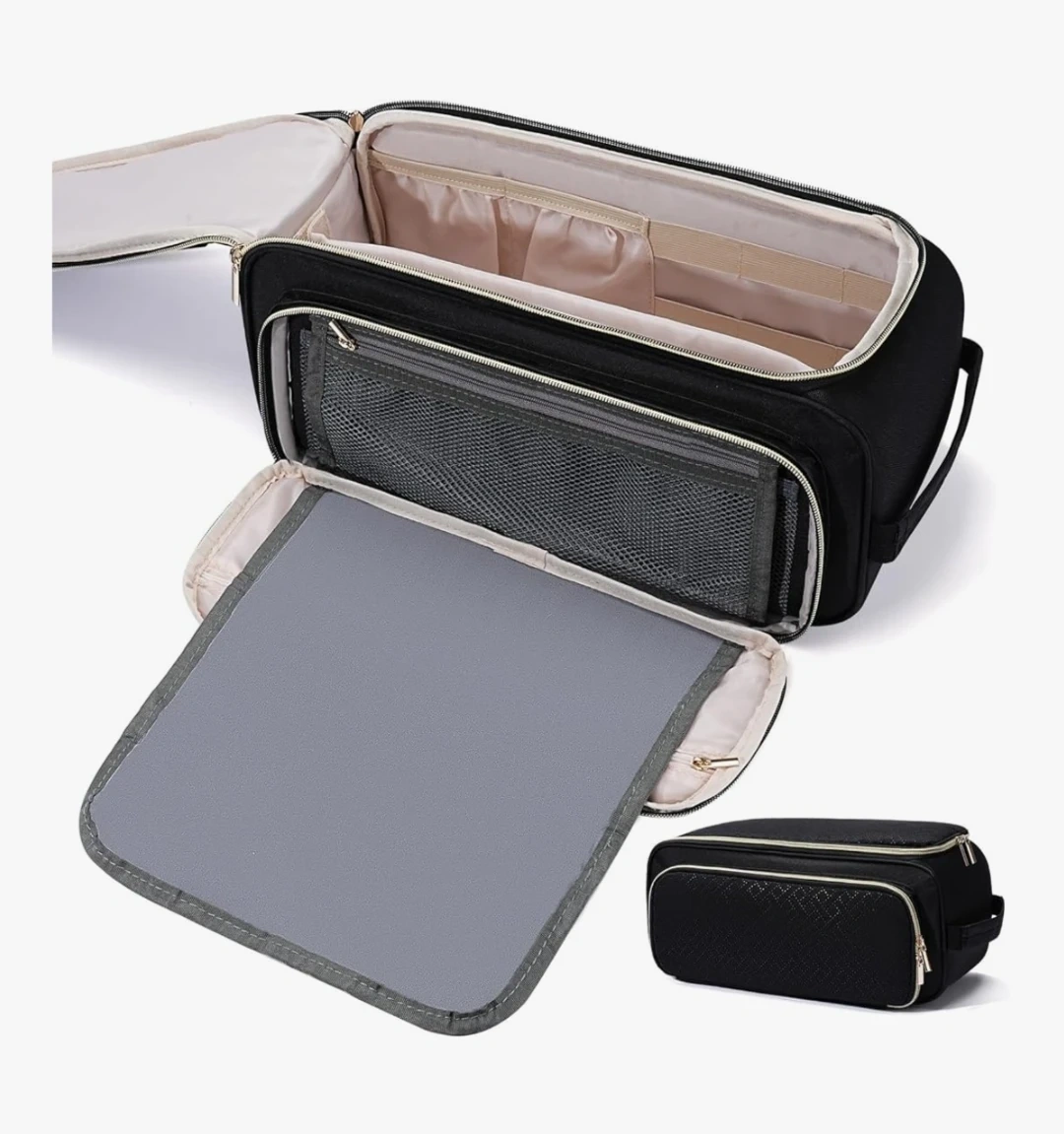 This black toiletry bag organizer is great for travel. It features multiple compartments inside for easy organization.