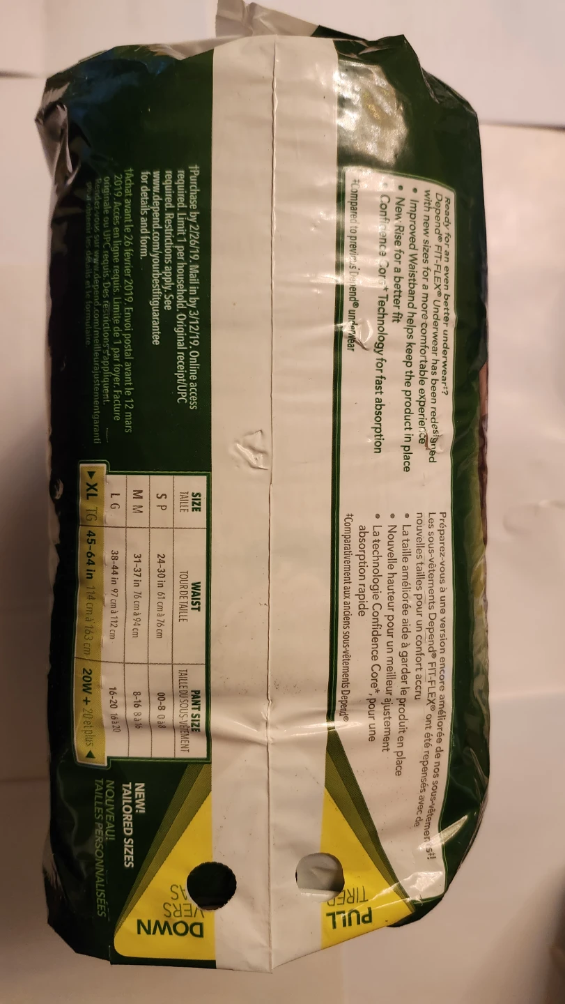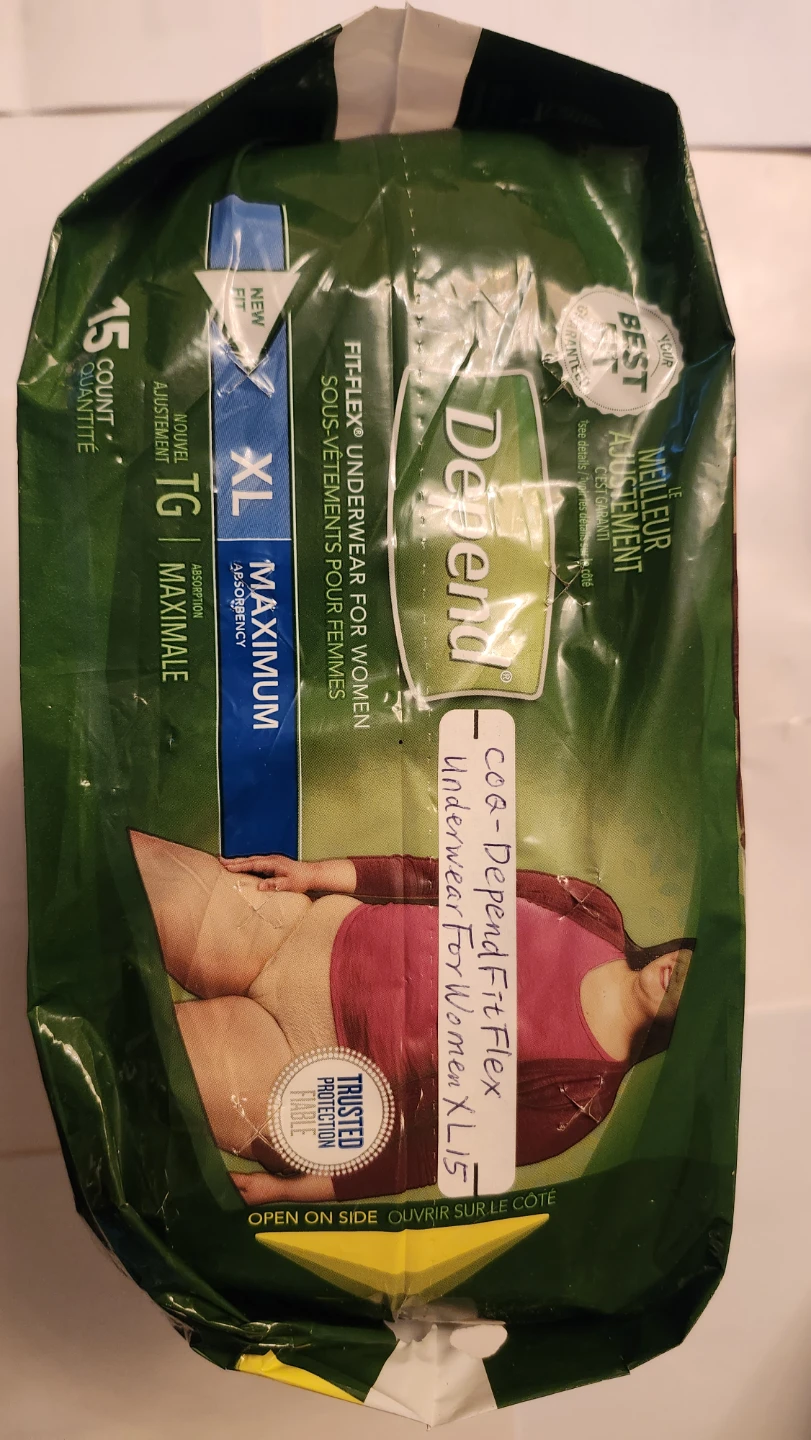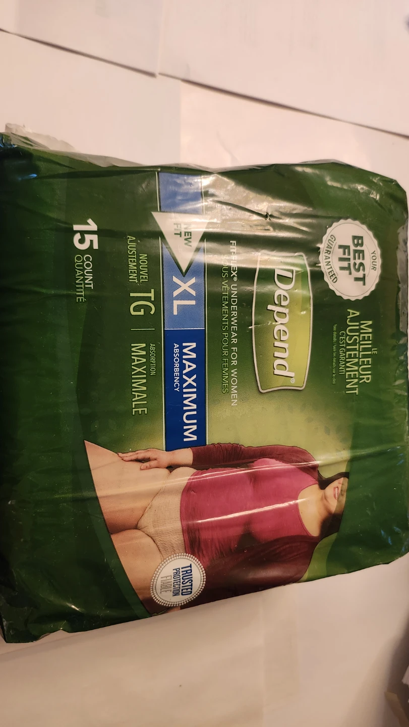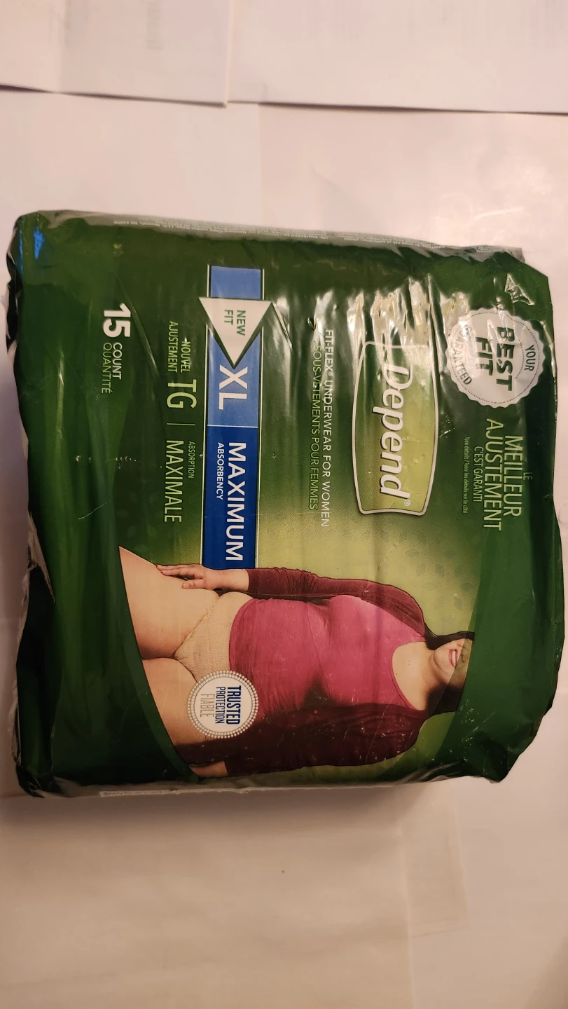 Selling a package of Depend Fit-Flex Underwear for Women, size XL. These offer maximum absorbency and a comfortable fit with their Fit-Flex design. The package contains 15 count. They are designed for better underwear-like fit with new sizes for a more comfortable and reliable fit.