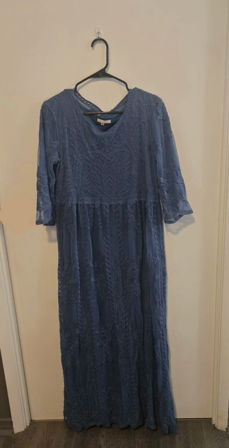Beautiful blue lace maxi dress with 3/4 sleeves. Features an intricate lace overlay design with floral and heart embroidery. Perfect for special occasions or a stylish everyday look!