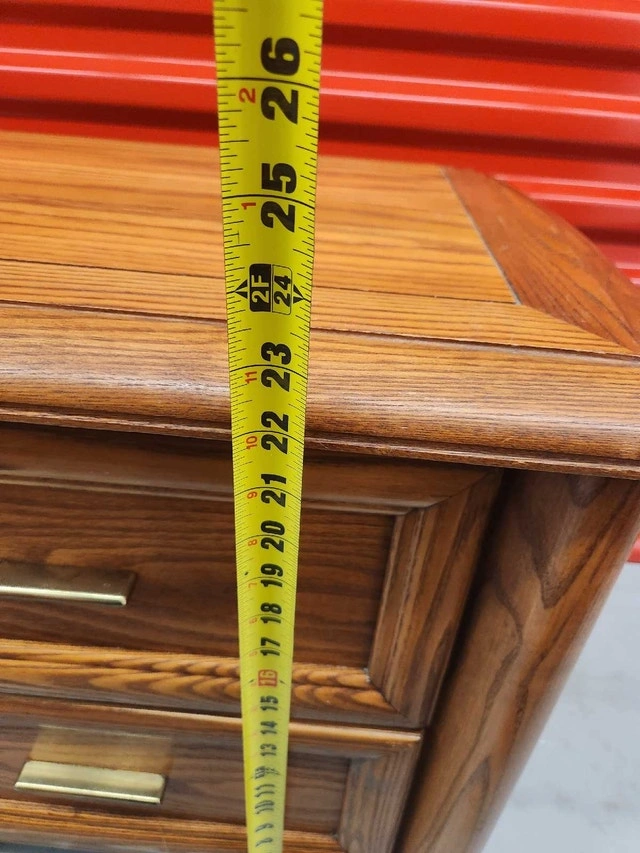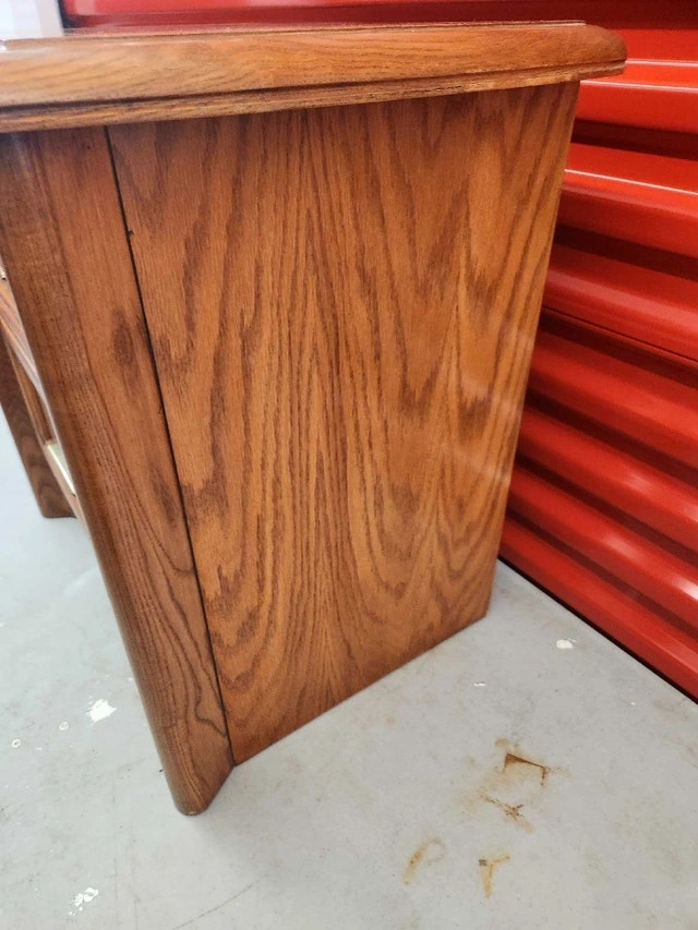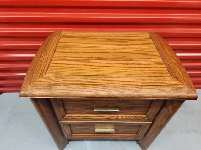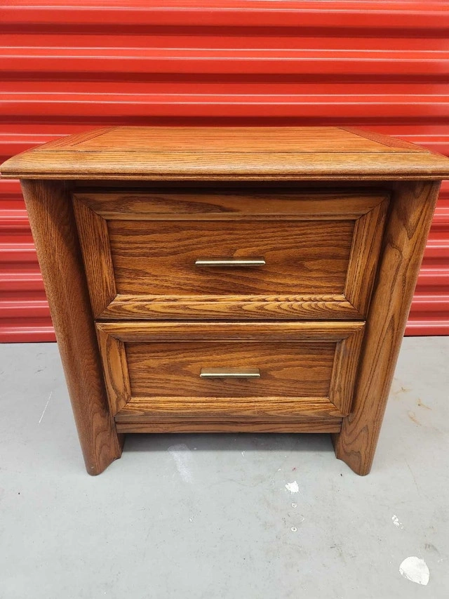This nightstand features a sturdy build and two spacious drawers, perfect for bedside storage. It's a used piece, showing some signs of wear but remains fully functional and adds a touch of warmth to any bedroom decor. Approximate dimensions: Height: 25 inches, Width: 22 inches, Depth: 17 inches. If this ad is up, it's still available!