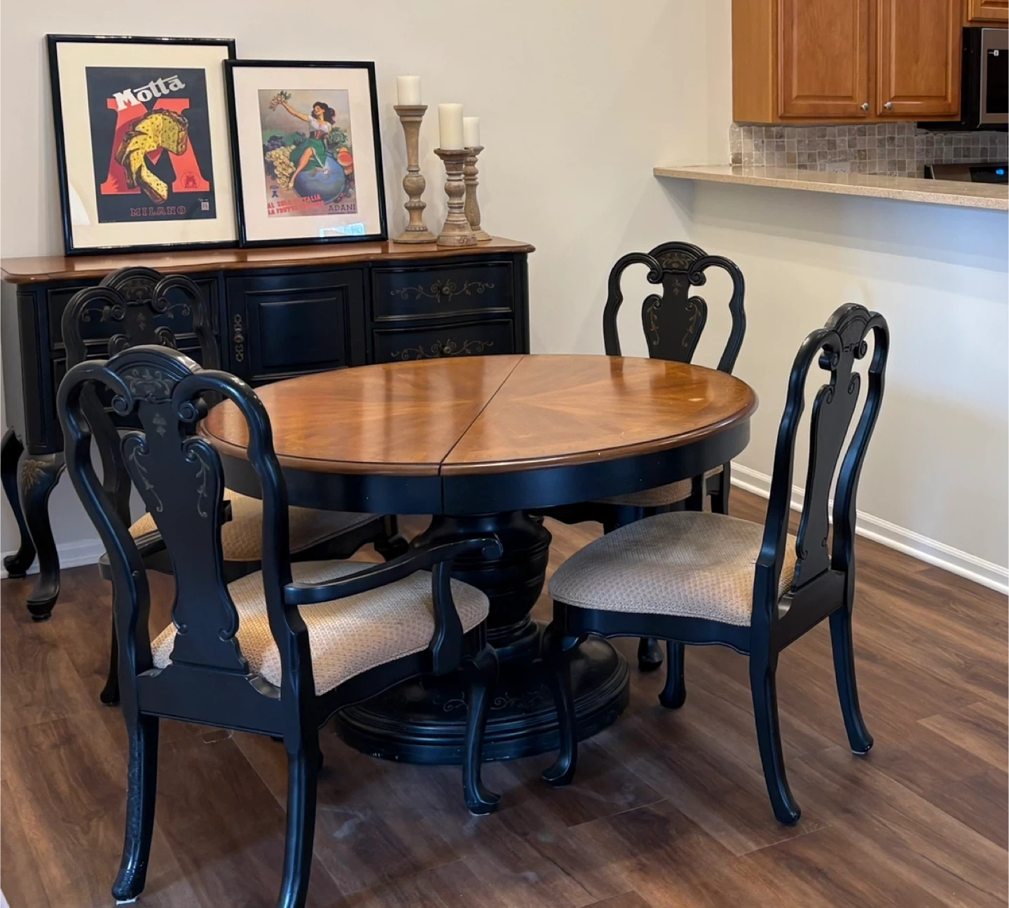 This dining set includes an oval wooden table with a pedestal base and four matching chairs. The chairs have upholstered seats and ornate black frames. It's suitable for a breakfast nook or small dining area. The table has a smooth wooden top. It also comes with a matching Bank cut a leaf to expand the table and two more chairs!! What a beautiful set.