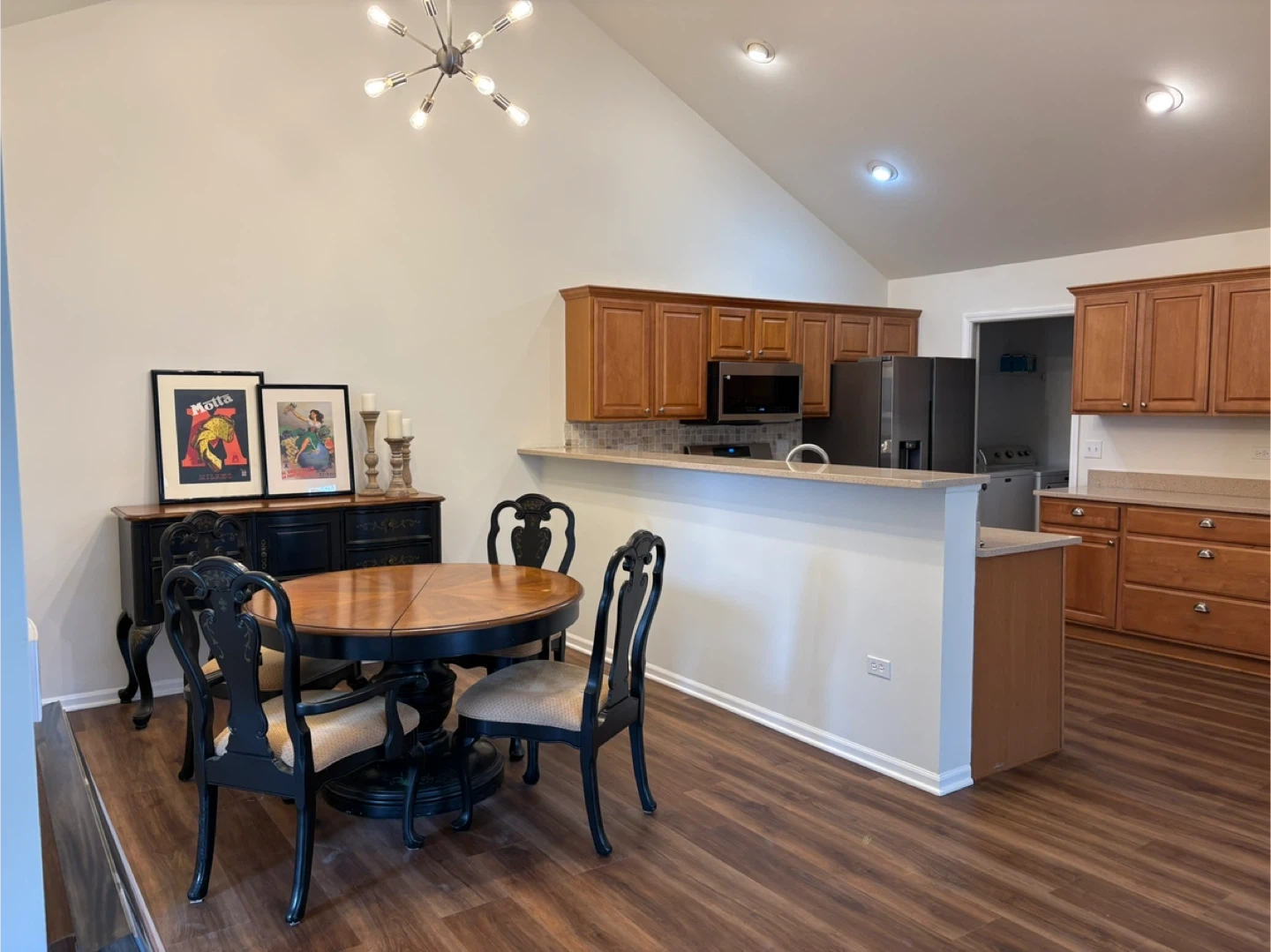 This dining set includes an oval wooden table with a pedestal base and four matching chairs. The chairs have upholstered seats and ornate black frames. It's suitable for a breakfast nook or small dining area. The table has a smooth wooden top. It also comes with a matching Bank cut a leaf to expand the table and two more chairs!! What a beautiful set.