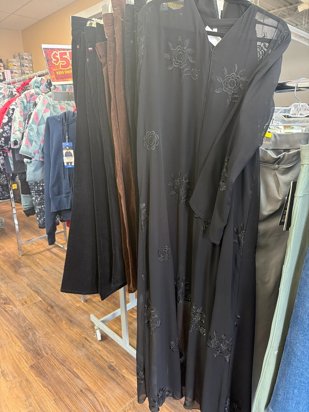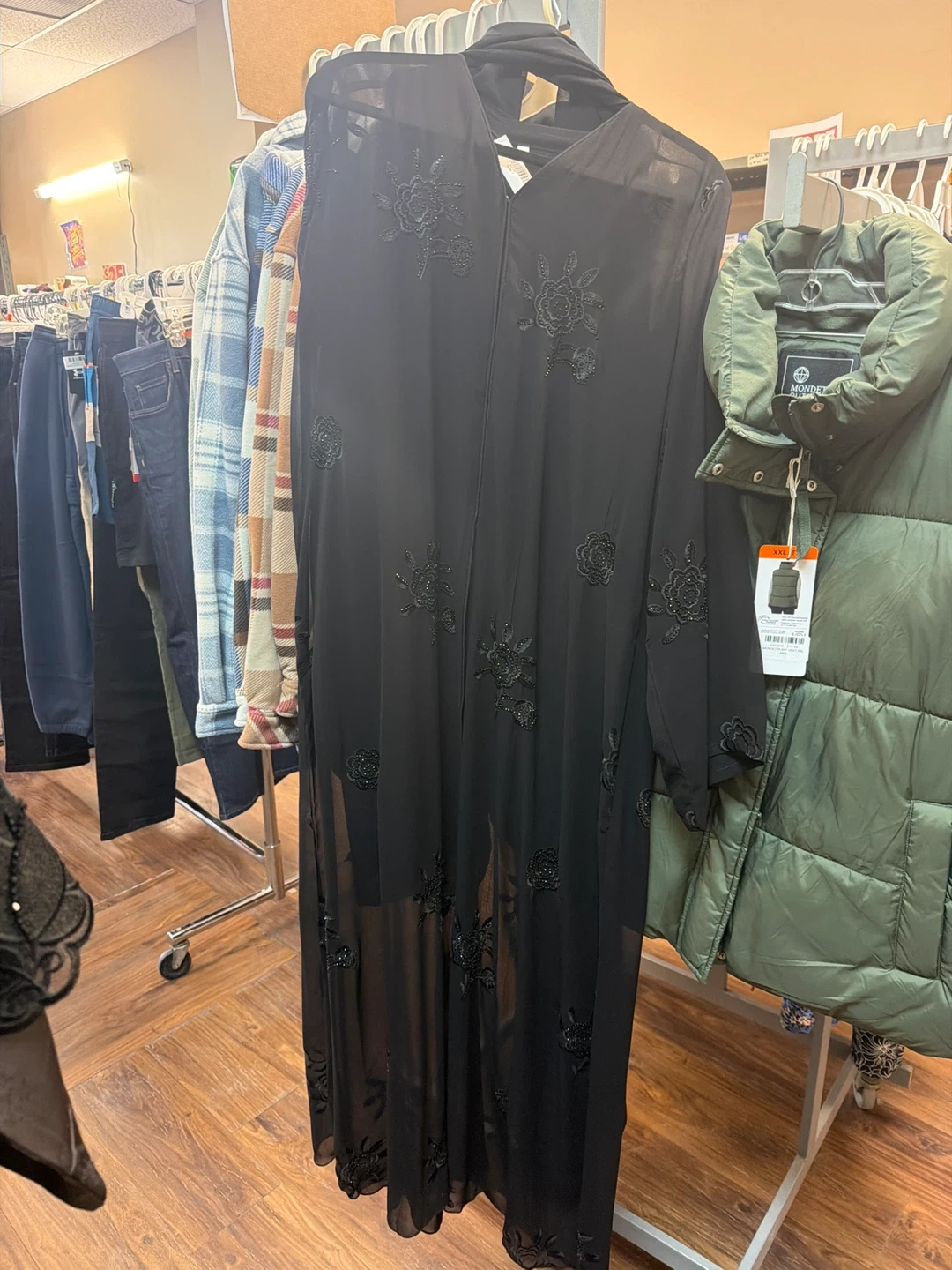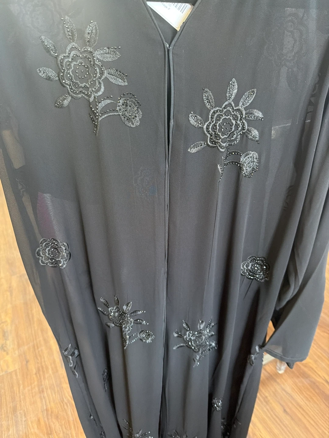 This is a beautiful black abaya made from a sheer material. It's adorned with intricate embroidered floral designs all over. It offers a lightweight and elegant feel.Size 56 available made in UAE