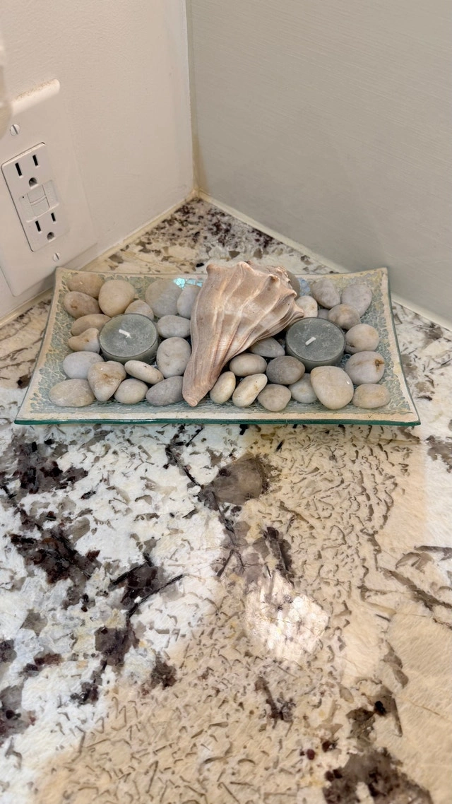 Moving sale! Enhance your home decor with this charming used seashell decor tray. It features a glass tray filled with smooth white pebbles, a large seashell, and two tea light candles. Adds a touch of coastal elegance to any room. Great condition, perfect for creating a relaxing ambiance in your bathroom, living room, or bedroom. Pick up in Quarry Park SE or Mahogany SE. Cash only.