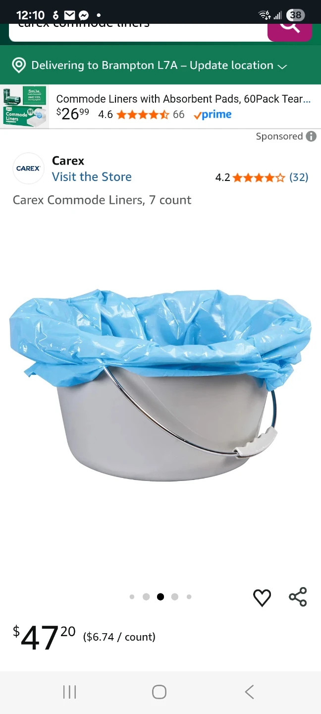 Selling a box of Carex commode liners, complete with 7 disposable liners! These liners absorb up to 2 quarts of liquid and help reduce odours, making bucket cleaning easier. They also have tie handles for quick and easy disposal. Great for multiple commode uses!