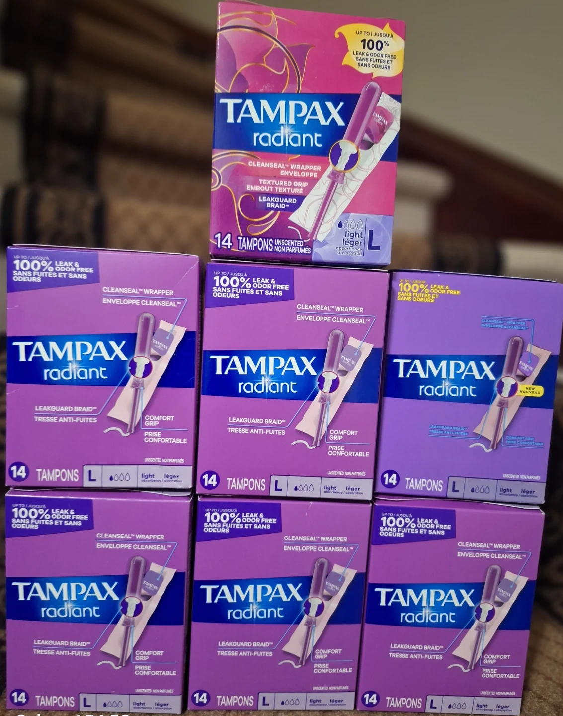 Tampax Radiant tampons offer 100% leak & odor protection. They feature a CleanSeal wrapper, textured grip, and LeakGuard braid for comfort and security. Each box contains 14 light absorbency tampons.