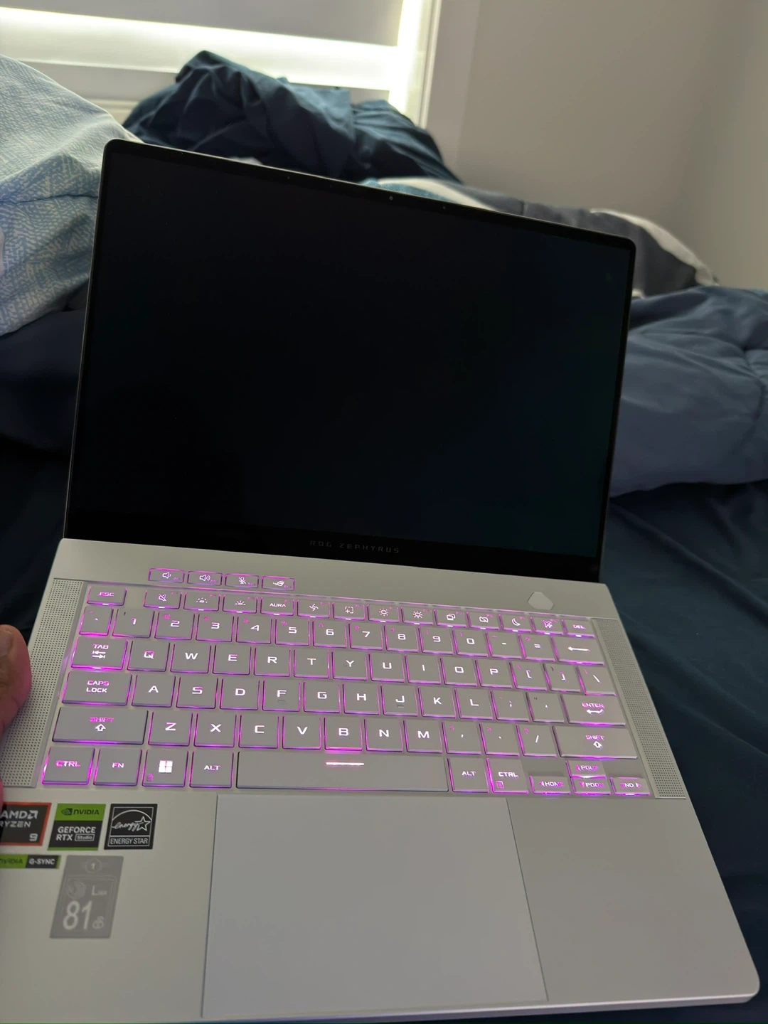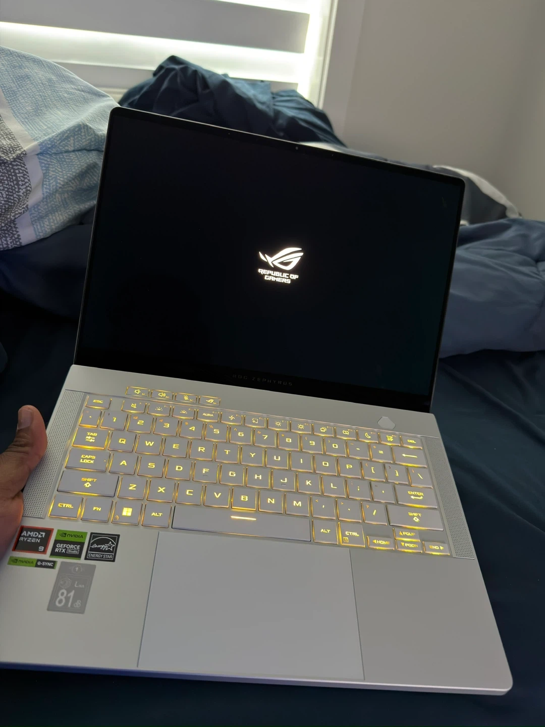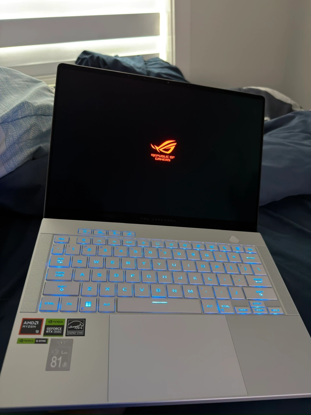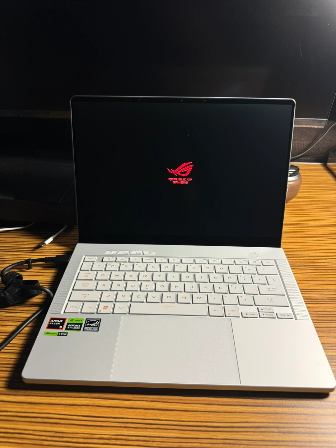 This ASUS ROG Zephyrus G14 is a powerful and portable gaming laptop. It boasts a sleek white design with customizable RGB keyboard lighting. Perfect for gaming and everyday tasks!