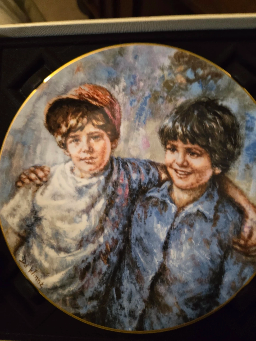 This is the fourth in a series of collector plates, worldwide edition of 10,000. The plate depicts "Buddies", an original work by Lisette De Winne. It's made of fine bone china. The original box is included.