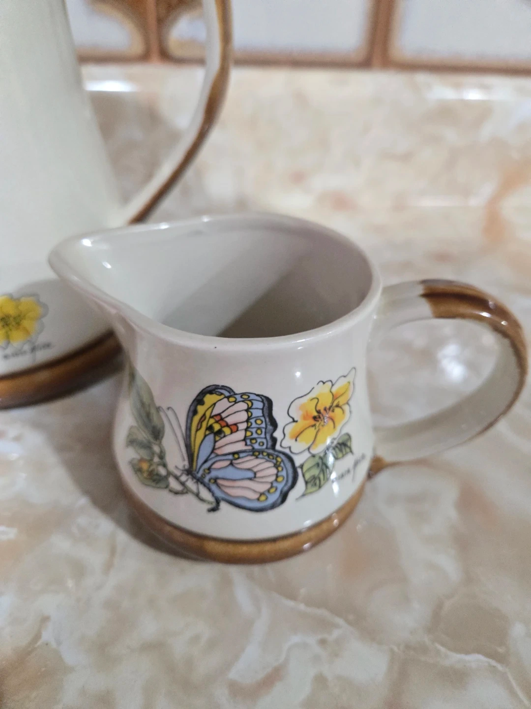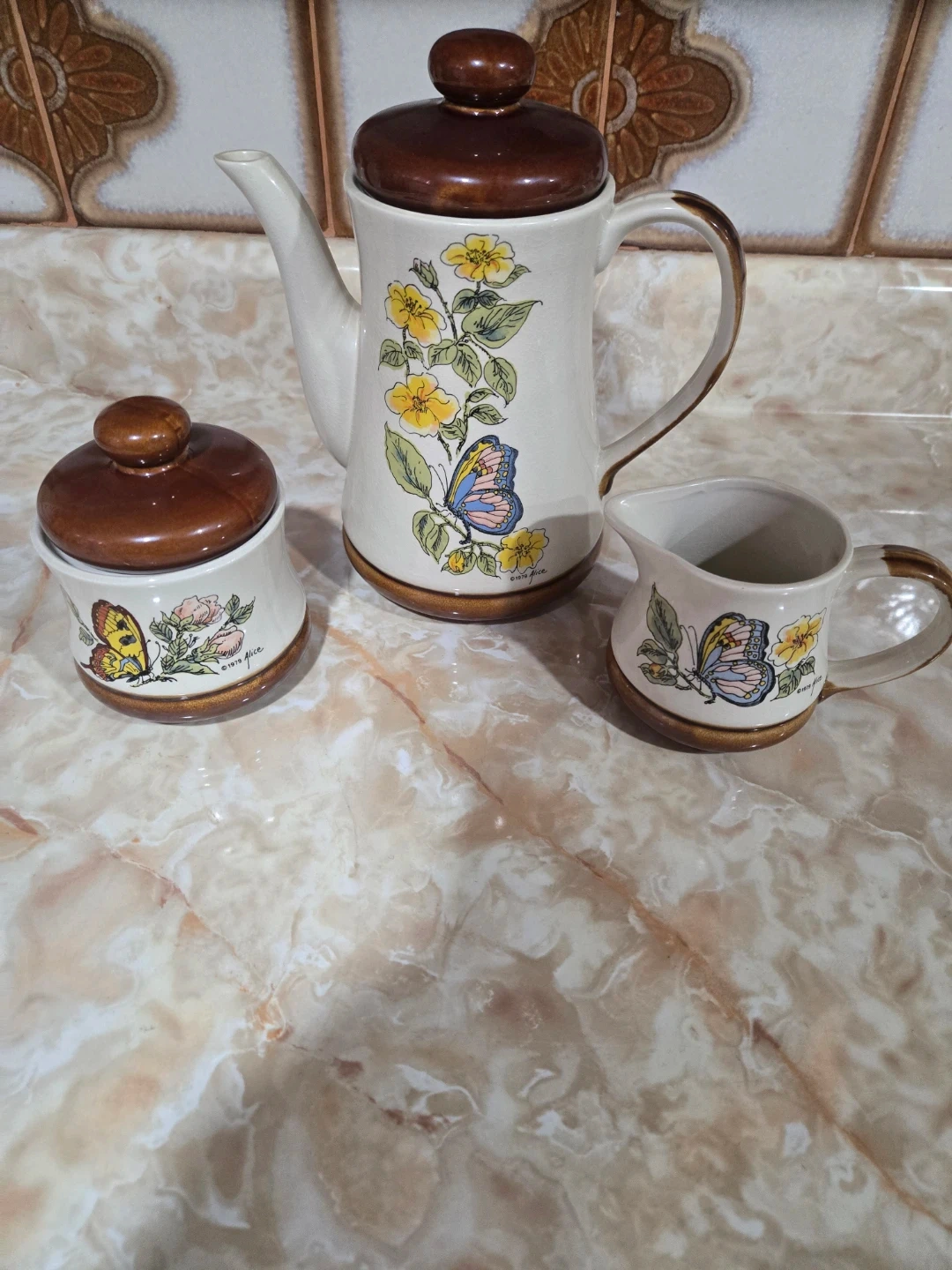 This charming ceramic tea set includes a teapot, sugar bowl, and creamer, all adorned with a lovely floral and butterfly design. The pieces feature brown lids and accents, with visible text indicating '1979 Florence'. It's a delightful addition to any kitchen. Made in Japan. Pickup only mississauga $10 firm.