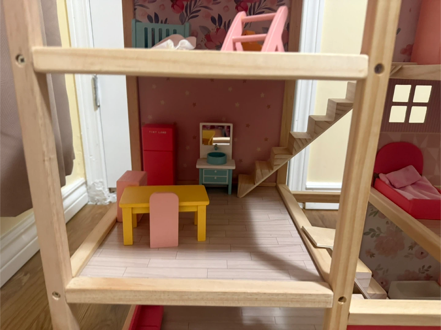 This charming wooden dollhouse comes fully furnished with miniature accessories for hours of imaginative play. It features multiple levels and rooms, complete with beds, a table, chairs, and a refrigerator. It's designed for little ones to create their own stories and scenarios!
